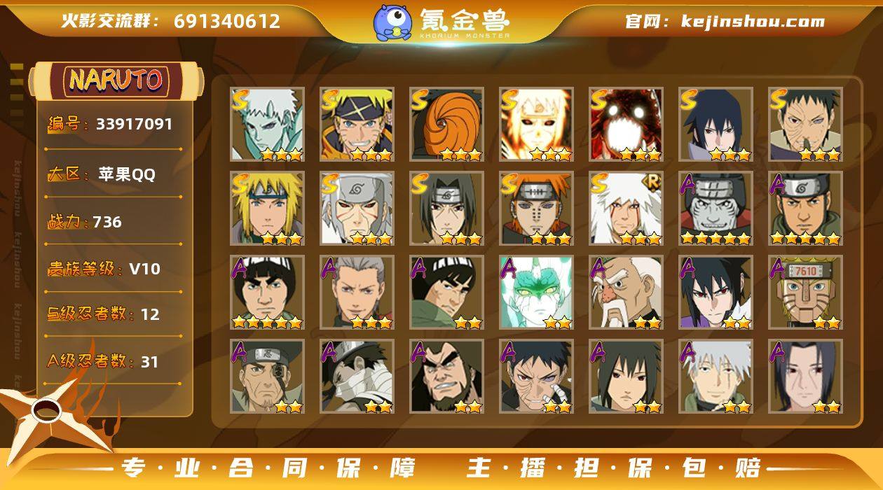 【HYSA1240】VIP等级V10/战力736W/S忍数量12/A忍数量31/通灵兽数量17/二星A-波风水门「新春限定」/二星A-宇智波带土「漂泊浪客」/二星A-大野木「侠隐江湖」/三星S-波风水门「九喇嘛连结」/三星S-宇智波带土「十尾人柱力」/二星A-飞段「死司凭血」/三星S-宇智波佐助「永恒万花筒」/五星A-猿飞阿斯玛/三星S-宇智波带土 「忍界大战」/三星A-飞段/二星A-宇智波佐助「侠隐江湖」/二星A-我爱罗 「新春限定」/二星A-蝎/三星S-佩恩「天道」/二星A-桃地再不斩「漂泊武士」/三星S-漩涡鸣人·宇智波佐助/三星S-波风水门/二星A-秋道丁次「忍界大战」/五星A-迈特凯/二星A-宇智波鼬「新春限定」/三星S-千手扉间「秽土转生」/二星A-土台「忍界大战」/二星A-波风水门 「青年」/三星S-自来也「舞之豪杰」/三星S-漩涡鸣人 「暴怒·第六尾」/二星A-桃地再不斩「秽土转生」/二星A-千手扉间「漂泊武士」/2星迪达拉「晓创生」/二星A-神农 「羁绊」/二星A-宇智波鼬 「夏日限定」/二星A-宇智波泉奈/二星A-宇智波止水「新春限定」/二星A-迪达拉/二星A-旗木卡卡西 「幻之真容」/二星A-巳月「仙人模式」/二星A-小南「漂泊浪客」/二星A-艾 「青年」/二星A-迈特凯「青春爆炸」/二星A-宇智波佐助「须佐能乎」/...