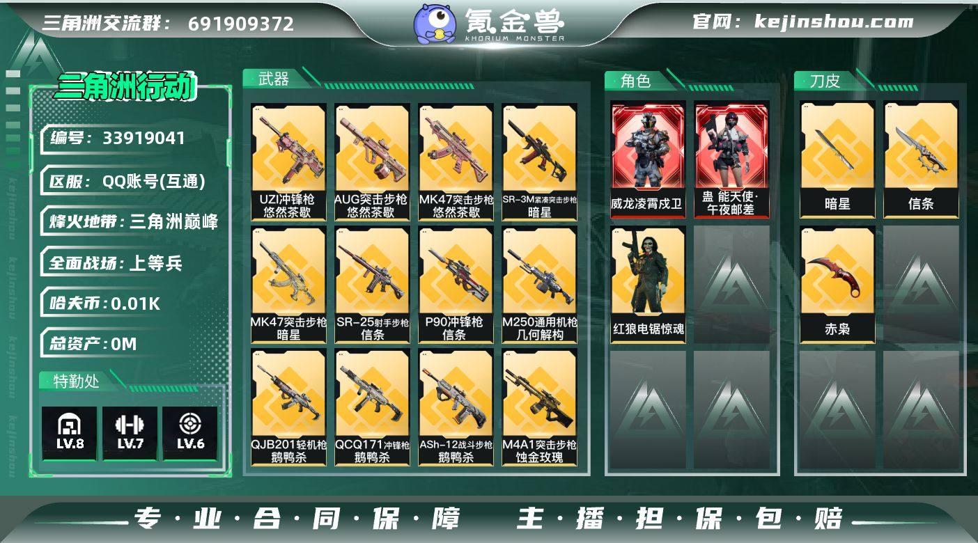 实名: 可修改 烽火地带段位: 三角洲巅峰 全面战场段位: 上等兵 总资产: 182 哈夫币: 11 干员外观: 蛊-能天使·午夜邮差,红狼-电锯惊魂,威龙-凌霄戍卫 传说武器皮肤: 近战-赤枭,M4A1突击步枪-蚀金玫瑰,M4A1突击步枪-阿米娅,M250通用机枪-骑士之心,M7战斗步枪-棱镜攻势S2(典藏),R93狙击步枪-维什戴尔,SCAR-H战斗步枪-启航,ASh-12战斗步枪-鹅鸭杀,QCQ171冲锋枪-鹅鸭杀,QJB201轻机枪-鹅鸭杀,M250通用机枪-几何解构,KC17突击步枪-电锯惊魂,近战-信条,P90冲锋枪-信条,SR-25射手步枪-信条,SG552突击步枪-运动员,SKS射手步枪-骑士,近战-暗星,MK47突击步枪-暗星,SR-3M紧凑突击步枪-暗星,M14射手步枪-蛮荒,K416突击步枪-行动记录,腾龙突击步枪-马年祥瑞,G18-马年祥瑞,.357左轮-缄花,SR-25射手步枪-缄花,M14射手步枪-缄花,MK47突击步枪-悠然茶歇,AUG突击步枪-悠然茶歇,UZI冲锋枪-悠然茶歇 亮点: 【优质装备】:近战-赤枭
