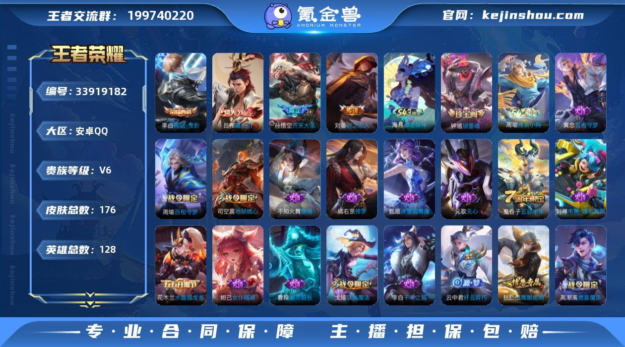 实名: 可修改 性别: 女号 贵族等级: V6 英雄数: 128 皮肤数: 176 荣耀水晶: 鸣剑·曳影 传说皮: 时之恋人-刘备,吕布曦玄引 限定皮: 游园惊梦,五谷丰年,齐天大圣 亮点: 【优质装备】:鸣剑·曳影,时之恋人-刘备(电焊工)