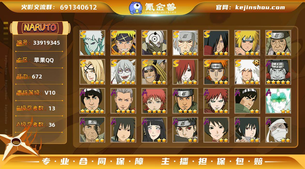 【HYC1848】VIP等级V10/战力672W/S忍数量13/A忍数量36/三星S-宇智波斑「秽土转生」/二星A-波风水门「新春限定」/三星S-纲手「百豪」/三星S-宇智波带土「十尾人柱力」/二星A-飞段「死司凭血」/二星A-宇智波止水/2星小南「神驹佑将」/三星S-猿飞日斩「秽土转生」/二星A-照美冥「五代目水影」/二星A-猿飞阿斯玛「秽土转生」/五星A-迈特凯/二星A-宇智波鼬「新春限定」/三星S-千手扉间「秽土转生」/三星S-药师兜「仙人模式」/二星A-春野樱「百豪」/三星S-宇智波斑「白面具」/二星A-宇智波带土「暴怒」/二星A-黑土「四代目土影」/二星A-勘九郎「忍界大战」/二星A-迪达拉「秽土转生」/二星A-药师兜「半蛇斗篷」/二星A-宇智波佐助「万花筒写轮眼」/二星A-我爱罗「忍界大战」/二星A-迪达拉/二星A-漩涡鸣人「九尾查克拉」/二星A-猿飞木叶丸「博人传」/二星A-大蛇丸「晓」/三星S-金角/银角「秽土转生」/二星A-宇智波鼬/三星S-佩恩「天道」/二星A-桃地再不斩「漂泊武士」/三星S-漩涡鸣人·宇智波佐助/四星A-蝎/三星S-波风水门「秽土转生」/二星A-秋道丁次「忍界大战」/三星A-我爱罗「疾风传」/二星A-土台「忍界大战」/四星A-猿飞阿斯玛/三星S-自来也「舞之豪杰」/四星A-飞段/二星A-日向雏田...