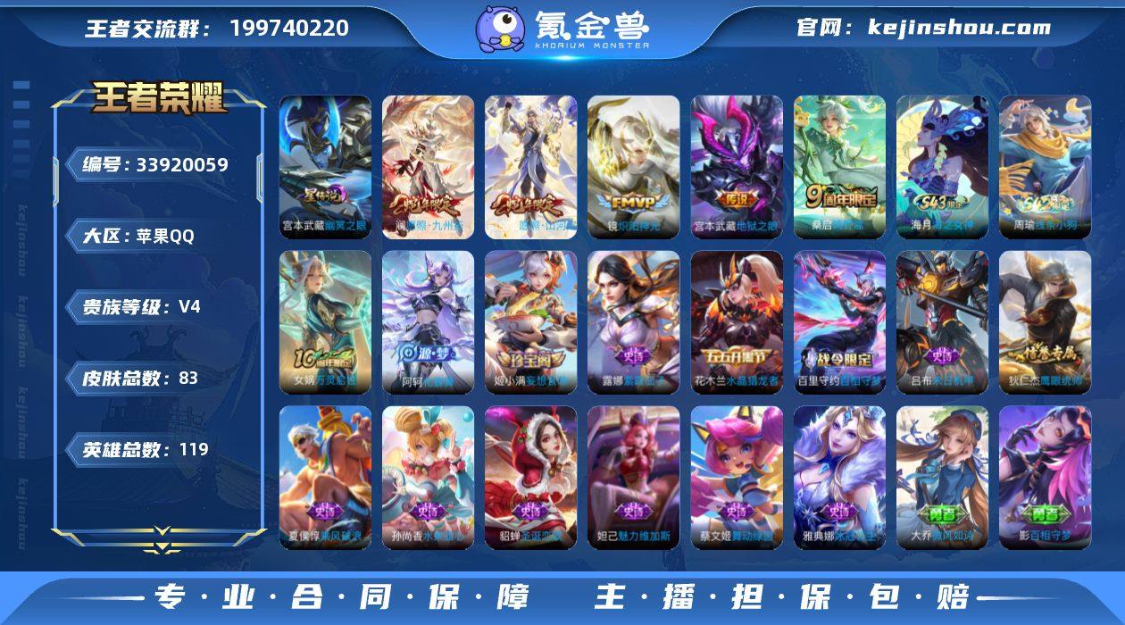 贵族等级: V4 英雄数: 119 皮肤数: 83 星传说: 幽冥之眼 传说皮: 炽阳神光,地狱之眼 限定皮: 鸣野蒿,逐霄战戟,愿照·山河定,愿照·九州拓
