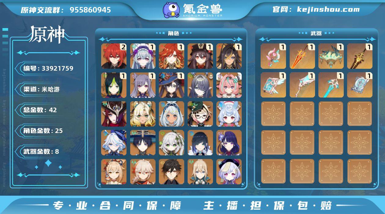 邮箱: 未绑定 总黄数: 42 冒险等级: 57 2命金色角色: 二命迪卢克 1命金色角色: 一命刻晴,一命莫娜,一命胡桃,一命提纳里,一命迪希雅,一命玛薇卡,一命梦见月瑞希 0命金色角色: 枫原万叶,宵宫,七七,钟离,琴,雷电将军,夜兰,纳西妲,流浪者,芙宁娜,希格雯,艾梅莉埃,玛拉妮,希诺宁,恰斯卡,瓦雷莎,菈乌玛 拥有武器: 天空之翼,四风原典,天空之卷,天空之刃,苇海信标,鹤鸣余音,焚曜千阳,溢彩心念 1精武器: 天空之翼,四风原典,天空之卷,天空之刃,苇海信标,鹤鸣余音,焚曜千阳,溢彩心念 亮点: 【sy204】57级/42黄/男主/25个五星角色/8个五星武器0命希格雯,0命芙宁娜,1命迪希雅,0命流浪者,0命纳西妲,1命提纳里,0命夜兰,0命雷电将军,0命枫原万叶,0命钟离,1命胡桃,0命宵宫,1命刻晴,0命七七,0命琴,1命莫娜,2命迪卢克,0命希诺宁,0命玛拉妮,0命艾梅莉埃,0命恰斯卡,1命玛薇卡,1命梦见月瑞希,0命瓦雷莎,0命菈乌玛,精1鹤鸣余音,精1苇海信标,精1四风原典,精1天空之翼,精1天空之刃,精1天空之卷,精1焚曜千阳,精1溢彩心念