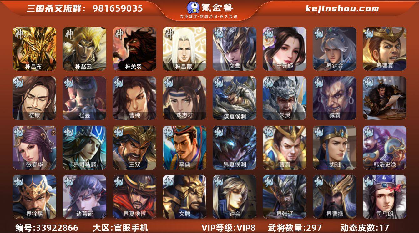 VIP等级: VIP8 官阶: 骠骑将军 武将数量: 297 动态皮肤数量: 17 神将: 神吕布,神赵云,神关羽,神吕蒙 魏国武将: 戏志才,曹纯,程昱,嵇康,界曹真,界钟会,王元姬,文鸯,唐咨-魏,张辽,SP蔡文姬,SP关羽,SP贾诩,SP姜维,SP庞德,蔡贞姬,曹昂,曹操,曹冲,曹洪,曹丕,曹仁,曹叡,王异,鲁芝,界满宠,界曹植,满宠,荀攸,王基,钟繇,郭嘉,牵招,荀彧,阮慧,杜畿,界郭嘉,崔琰,界曹丕,界荀彧,朱灵,界甄姬,吕虔,界王异,界许褚,华歆,陈群,界邓艾,袁涣,李通,乐进,辛宪英,郭淮,毛玠,郭皇后,夏侯惇,曹植,司马朗,谋于禁,界曹操,许褚,界张辽,谋徐晃,张郃,钟会,文聘,曹彰,界夏侯惇,诸葛诞,司马懿,甄姬,界徐晃,徐晃,韩浩史涣,胡班,曹真,典韦,界夏侯渊,夏侯渊,李典,于禁,王双,邓艾,界司马懿,张春华,孟达-魏,臧霸,朱灵(国战),谋夏侯渊 蜀国武将: 花鬘,界黄忠,谋马超,谋黄月英,徐庶,杨仪,界关羽,界诸葛亮,邓芝,界伊籍,胡金定,费祎,界张嶷,赵云,张松,界刘备,谋法正,刘封,糜竺,黄月英,关羽,吴懿,向宠,祝融,张飞,黄皓,陈震,魏延,界周仓,马忠,界法正,糜夫人,刘禅,关银屏,界祝融,SP孙尚香,SP徐庶,卧龙诸葛,周仓,简雍,界关兴张苞,诸葛亮,法正,赵统赵广,界马岱,关平,马岱,庞统,诸葛果,谋张飞,马谡,马超,廖化,关兴张苞,谋关...