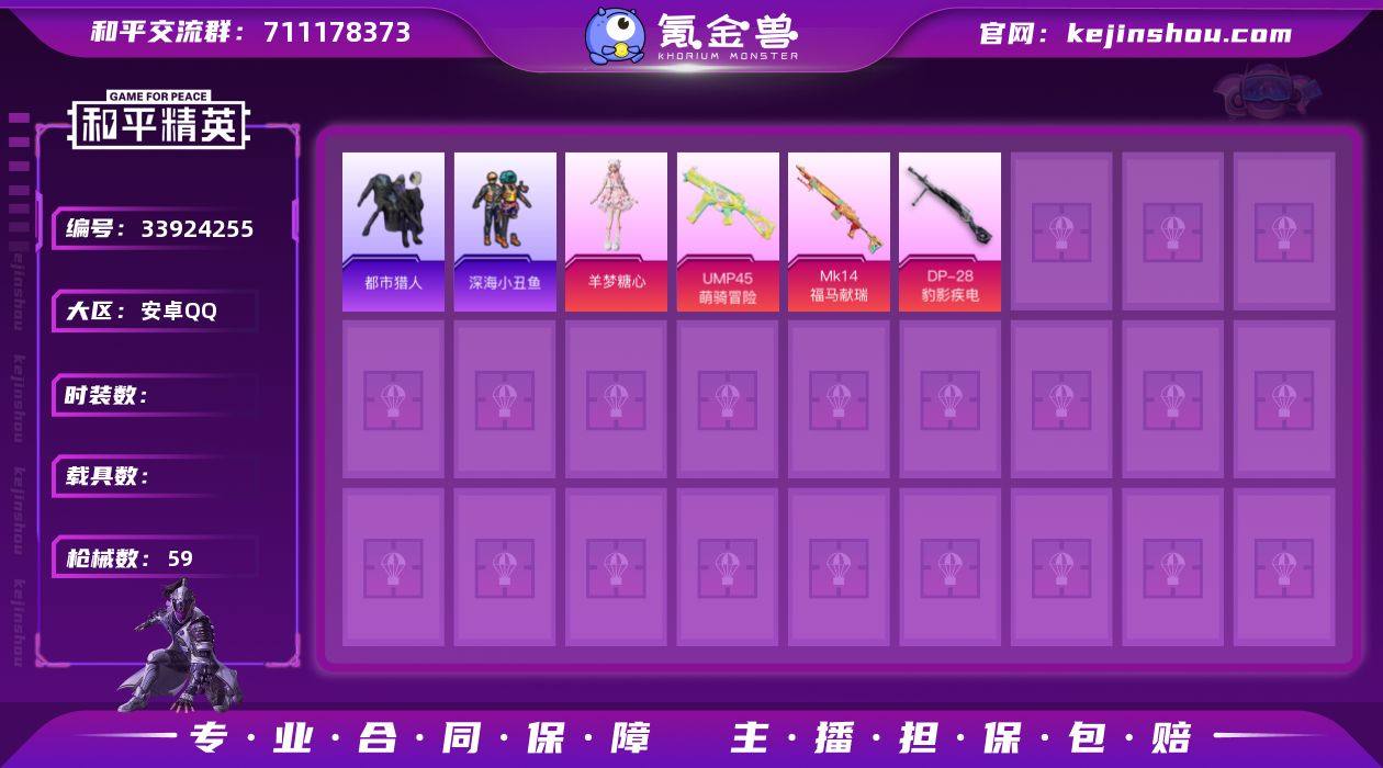 【0载具 3特效枪 1粉装 59枪皮 43套装】都市猎人,深海小丑鱼,Mark.06,羊梦糖心,Mk14-福马献瑞,UMP45-萌骑冒险,DP-28-豹影疾电,编号:JJWRC25