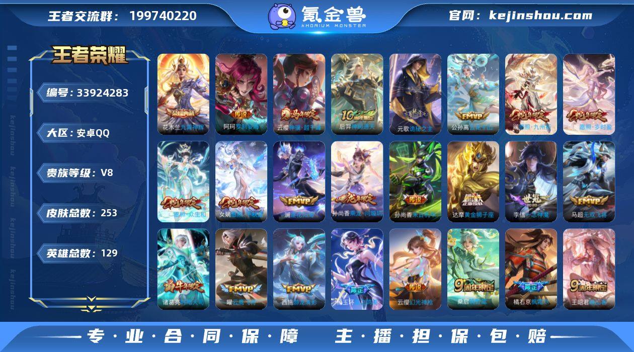 安卓Q-V8-至尊星耀II段位-129英雄-253皮肤-1典藏皮肤-30传说-76史诗 【英雄全皮】:孙权全皮,百里守约全皮,敖隐全皮,赵怀真全皮,少司缘全皮 【荣耀典藏】:花木兰九霄神辉 【传说皮肤】:阿轲罗刹妄海,云缨神骥越千峰,后羿神树通天,元歌诡秘之主,公孙离云诺千山,杨玉环星之鸣奏,女娲愿照千秋盛,妲己愿照众生和,澜愿照九州拓,虞姬愿照岁时盈,云缨幻光神枪,嬴政玄雷天君,王昭君映山客,桑启鸣野蒿,海月金乌负日,孙尚香乘龙问璇玑,澜逐花归海,干将莫邪画中仙,王昭君星穹之声,百里守约碎云,橘右京枫霜尽,马超无双飞将,露娜启示之音,西施游龙清影,诸葛亮时雨天司,虞姬启明星使,曜云鹰飞将,李信一念神魔,达摩黄金狮子座,孙尚香末日机甲 【限定皮肤】:蒙犽顽岩魄,蔡文姬夏日便利店,大乔绒语心约,虞姬夏日便利店,姜子牙天穹之誓,狄仁杰阴阳师,赵云皇家上将,元歌无心,甄姬游园惊梦,狄仁杰魔术师,达摩沙漠行僧,项羽海滩派对,露娜启示之音,王昭君星穹之声,橘右京枫霜尽,李元芳云中旅人,虞姬启明星使,女娲朔望之晖,干将莫邪画中仙,诸葛亮时雨天司,百里玄策原初追逐者,百里守约朱雀志,公孙离玉兔公主,裴擒虎李小龙,裴擒虎擒涛扼...