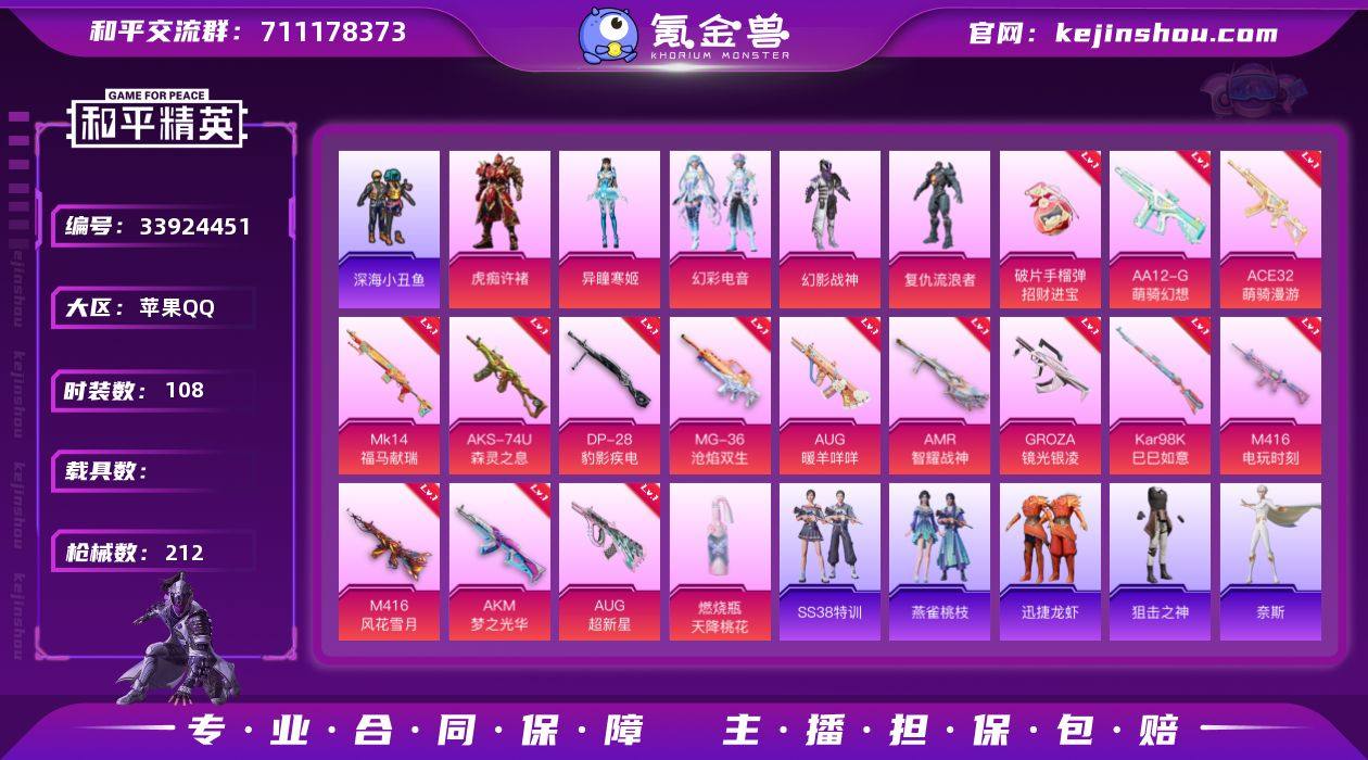 【满级M4风花雪月红眼罩16特效枪5粉装 秒换绑不用等】 苹果Q区-58359热力值-108套装-212枪皮 【3稀有】 M416-黄金龙骨 AWM-黄金龙骨 红眼罩【5粉装】 复仇流浪者 虎痴许褚 幻影战神 角色-异瞳寒姬 幻彩电音【16特效枪】 M416-风花雪月(7级) AKM-梦之光华(4级) AKS-74U-森灵之息(5级) Mk14-福马献瑞(5级) AA12-G-萌骑幻想(2级) ACE32-萌骑漫游(2级) 破片手榴弹-招财进宝(5级) 燃烧瓶-天降桃花(5级) AUG-超新星(5级) AMR-智耀战神(4级) Kar98K-巳巳如意(5级) AUG-暖羊咩咩(5级) M416-电玩时刻(5级) GROZA-镜光银凌(5级) DP-28-豹影疾电(5级) MG-36-沧焰双生(5级)【215热门】 深海小丑鱼 暗影哥特(红眼罩) 浪漫天命 雪山精英(老6服) 迅捷狂鲨 白色伏地魔 SS27特训 NV战队服 SCAR-L-玉兔迎春 AUG-幻影战神 Mk47-乌木金纹 UZI-娇憨猪猪 UMP45-蓝色火焰 M249-彩虹符号 鹰眼刺客 M416-蓝色火焰 破蛋小黄鸡 长空猛禽 弄潮海豚 夏日倾情 牛气冲天 魅力单车 黄色运动 海岛探路者 纯真浪花 S1897-糯团青竹 AA12-G-雨过天青 沙漠之鹰-雨过天青 平底锅-画境星梦 超感刻度 P90-紫矿核心 GROZA-紫矿核心 M16A4-雨过天青 SPAS-12-福马献瑞 Vector-荒原烈焰 SLR-天象三御 雨过天青 破片手榴弹-...