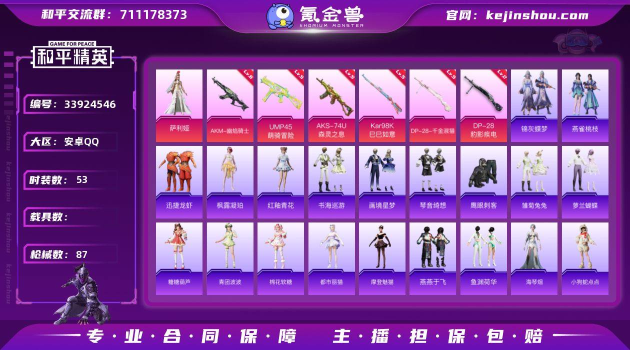 安卓手Q-1粉装-6特效枪-1粉色飞行器-28294热力值-5王牌印记-53套装-87枪皮 【粉色套装】:角色-萨利娅 【粉色枪皮等级】:AKM-幽焰骑士(六级),UMP45-萌骑冒险(五级),AKS-74U-森灵之息(五级),Kar98K-巳巳如意(五级),DP-28-千金淑猫(五级),DP-28-豹影疾电(二级) 【粉色枪皮】:AKM-幽焰骑士,UMP45-萌骑冒险,AKS-74U-森灵之息,Kar98K-巳巳如意,DP-28-千金淑猫,DP-28-豹影疾电 【粉色飞行器】:幽焰列车飞行器 【粉色降落伞】:英伦信使降落伞,BEARBRICK降落伞,未来领航者降落伞,幽焰骑士降落伞,千金淑猫降落伞,智耀战神降落伞,鸢尾珑雾降落伞 【稀有套装】:套装-迅捷龙虾,套装-雏菊兔兔,套装-萝兰蝴蝶,套装-糖糖葫芦,套装-青团波波,套装-棉花软糖,角色-都市丽猫,角色-摩登魅猫,套装-燕燕于飞,套装-鱼渊荷华,角色-海琴烟,玩偶服-小狗蛇点点,角色-灵公主,套装-书海巡游,套装-画境星梦,套装-琴音绮想,套装-雨过天青,套装-红釉青花,角色-枫露凝珀,套装-锦灰蝶梦,套装-燕雀桃枝 【稀有枪皮】:AKM-影袭,AKM-环太平洋,M16A4-千金淑猫,SCAR-L-炫彩节奏,M416-蓝色火焰,M416-兴海奇遇,GROZA-影袭,GROZA-暮色玫影,AUG-甜蜜菠萝,QBZ-洛神天依...