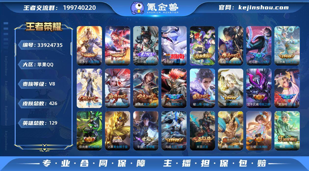苹果Q-V8-永恒钻石II段位-129英雄-426皮肤-2典藏皮肤-1无双-2珍品传说-32传说-124史诗 【英雄全皮】:刘禅全皮,扁鹊全皮,司马懿全皮,孙权全皮,鬼谷子全皮,沈梦溪全皮,狂铁全皮,马超全皮,敖隐全皮,蒙恬全皮,桑启全皮,夏洛特全皮,司空震全皮,戈娅全皮,空空儿全皮,影全皮,海诺全皮 【荣耀典藏】:花木兰九霄神辉,瑶拾光映像 【无双皮肤】:公孙离离恨烟 【珍品传说】:孙策时之奇旅,马可波罗怪盗基德 【传说皮肤】:马超神骥逐星野,司马懿九山相柳,公孙离云诺千山,司空震愿照山河定,云缨幻光神枪,桑启鸣野蒿,马超琥珀纪元,吕布遇见神鼓,马可波罗妄想实况,夏洛特浮生妄,干将莫邪画中仙,花木兰燃星之曲,曜山海苍雷引,李白诗剑行,马超无双飞将,孙策挚爱之约,露娜启示之音,孙策末日机甲,裴擒虎寅虎赤拳,公孙离祈雪灵祝,铠绛天战甲,镜炽阳神光,虞姬启明星使,关羽武圣,李信一念神魔,刘备时之恋人,张良黄金白羊座,虞姬云霓雀翎,达摩黄金狮子座,貂蝉仲夏夜之梦,孙尚香末日机甲,宫本武藏地狱之眼 【限定皮肤】:白起狰,公孙离离恨烟,蒙犽顽岩魄,蔡文姬夏日便利店,虞姬夏日便利店,姜子牙天穹之誓,狄仁杰阴阳师,虞姬凯尔特女王,赵...