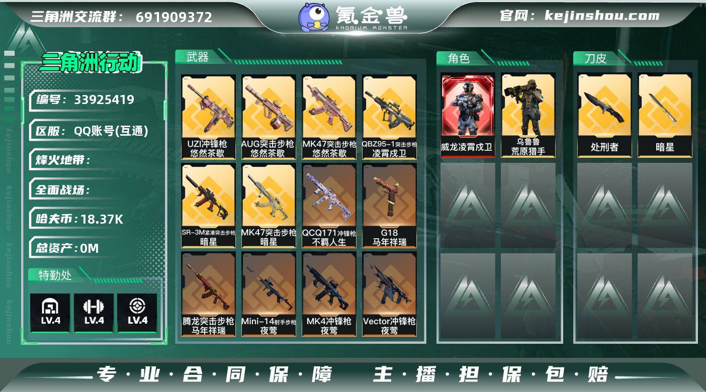 130m总资产-18378k哈夫币-60烽火等级-黄金-23战场等级-上等兵 【干员外观】:威龙-凌霄戍卫,乌鲁鲁-荒原猎手 【近战皮肤】:近战-暗星,近战-处刑者1级,近战-黑鹰 【传说外观】:QBZ95-1突击步枪-凌霄戍卫,K416突击步枪-行动记录,AUG突击步枪-悠然茶歇,腾龙突击步枪-马年祥瑞,MK47突击步枪-悠然茶歇,MK47突击步枪-暗星,Vector冲锋枪-夜莺,UZI冲锋枪-悠然茶歇,SR-3M紧凑突击步枪-暗星,QCQ171冲锋枪-不羁人生,MK4冲锋枪-夜莺,Mini-14射手步枪-夜莺,M14射手步枪-蛮荒,M14射手步枪-缄花,SR-25射手步枪-缄花,.357左轮-缄花,G18-马年祥瑞 【史诗外观】:K416突击步枪-腊梅,K416突击步枪-阿萨拉特攻,K416突击步枪-缄默情歌,AUG突击步枪-蝮蛇,K437突击步枪-丛影谍踪,KC17突击步枪-缄默情歌,SMG-45冲锋枪-阿萨拉特攻,SR-3M紧凑突击步枪-开工大吉,勇士冲锋枪-深海恐惧,勇士冲锋枪-丛影谍踪,MP7冲锋枪-六套之力,S12K霰弹枪-缄默情歌,PKM通用机枪-阿萨拉特攻,M249轻机枪-丛影谍踪,QJB201轻机枪-炽焰,VSS射手步枪-丛影谍踪, M14射手步枪-航天庆典,SV-98狙击步枪-猎鳄行动 【稀有外观】:AUG突击步枪-千里骏骨,AS Val突击步枪-休闲时光,M7战斗步枪-精...