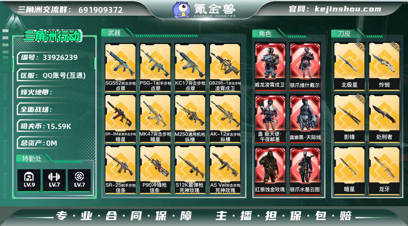 535m总资产-15598k哈夫币-60烽火等级-钻石-50战场等级-上等兵 【干员外观】:红狼-蚀金玫瑰,骇爪-水墨云图,露娜-黑·天际线,蛊-能天使午夜邮差,骇爪-维什戴尔,威龙-凌霄戍卫,威龙-壮志凌云,威龙-飞虎,蜂医-送葬人·无题密令,无名-夜鹰,深蓝-不破誓约,红狼-电锯惊魂,露娜-金牌射手,乌鲁鲁-荒原猎手,蛊-不羁人生 【近战皮肤】:近战-坠星者,近战-暗星,近战-北极星,近战-信条,近战-影锋,近战-怜悯,近战-龙牙,近战-处刑者4级,近战-黑鹰 【典藏外观】:K416突击步枪-命运*2 【典藏外观成色】:K416突击步枪-命运(优品C)*2 【传说外观】:M4A1突击步枪-蚀金玫瑰,M4A1突击步枪-阿米娅,AKM突击步枪-锦绣,QBZ95-1突击步枪-凌霄戍卫,ASh-12战斗步枪-怜悯,ASh-12战斗步枪-鹅鸭杀,K416突击步枪-尖峰行动,K416突击步枪-白鹰军团,K416突击步枪-行动记录,K416突击步枪-坠星者,AUG突击步枪-零重力,AUG突击步枪-西装暴徒,M7战斗步枪-白玫瑰,M7战斗步枪-零度协议,M7战斗步枪-怜悯,M7战斗步枪-巳蛇,M7战斗步枪-小肥柴,SG552突击步枪-运动员,SG552突击步枪-点翠,AK-12突击步枪-夜鹰,AK-12突击步枪-特斯拉线圈,AK-12突击步枪-纵横,SCAR-H战斗步枪-铁艺苍...