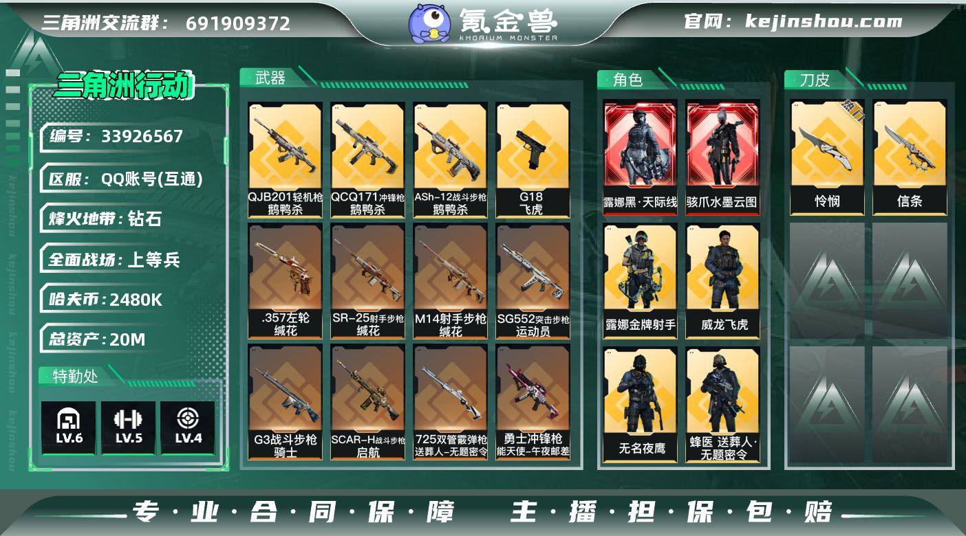 【热门皮肤号:双红+双刀+飞虎】【Q区三端互通】【无二次】YXz9417-特勤处:仓库6级/靶场4级/训练中心5级-总资产20m-哈夫币248w-烽火等级:60级 【干员外观】:骇爪-水墨云图,露娜-黑·天际线,威龙-飞虎,蜂医-送葬人·无题密令,无名-夜鹰,露娜-金牌射手 【近战皮肤】:近战-信条,近战-怜悯,近战-黑鹰 【传说外观】:M4A1突击步枪-阿米娅,ASh-12战斗步枪-鹅鸭杀,M16A4突击步枪-狩猎时刻,SG552突击步枪-运动员,AK-12突击步枪-夜鹰,AK-12突击步枪-特斯拉线圈,SCAR-H战斗步枪-水墨云图,SCAR-H战斗步枪-启航,G3战斗步枪-狩猎时刻,G3战斗步枪-骑士,CAR-15突击步枪-阿米娅,Vector冲锋枪-狩猎时刻,UZI冲锋枪-特斯拉线圈,SMG-45冲锋枪-骑士,SR-3M紧凑突击步枪-特斯拉线圈,勇士冲锋枪-能天使-午夜邮差,QCQ171冲锋枪-鹅鸭杀,725双管霰弹枪-送葬人-无题密令,QJB201轻机枪-鹅鸭杀,M14射手步枪-蛮荒,M14射手步枪-缄花,SR-25射手步枪-水墨云图,SR-25射手步枪-缄花,.357左轮-缄花,G18-飞虎,复合弓-黑·天际线 【史诗外观】:AKM突击步枪-林中猎手,QBZ95-1突击步枪-曙光,ASh-12战斗步枪-守夜人,M16A4突击步枪-竞赛选手,AUG突击步枪-蝮蛇,M7战斗步枪-百步穿杨...