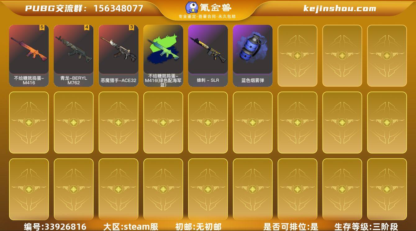 JDPX13997 生存500级可排位/5级不给糖就捣蛋-M416/不给糖就捣蛋-M416(绿色配海军蓝)/3级恶魔猎手-ACE32/4级青龙-BERYLM762/蓝色魔法烟枪/蓝色烟雾弹/尼尔头/白熊鞋/悲喜粉色套/ 0BJ4C7号 无排名, 生存等级1054, 名誉等级3, 金标数量2, 图纸3, 聚合物9482, 枪皮数量134, [成长型] 不给糖就捣蛋 - M416[5级], [成长型] 恶魔猎手 - ACE32[3级], [成长型] 青龙 - Beryl M762[4级]