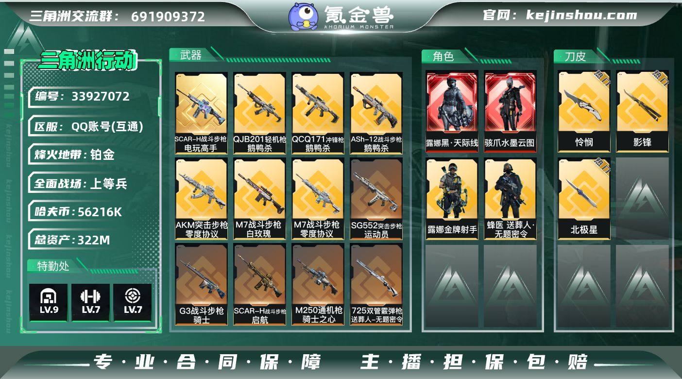 【多热门刀皮号+热门红皮号+高额资产322M:三刀皮+双红皮,怜悯+影锋+北极星-水墨云图+黑天际线】【典藏外观】:SCAR-H战斗步枪-电玩高手(极品C)【Q区三端互通】【7800三角卷】【无二次】YXz7660-特勤处:仓库9级/靶场7级/训练中心7级-总资产322.7m-哈夫币5621w-烽火等级:60级 【干员外观】:骇爪-水墨云图,露娜-黑·天际线,蜂医-送葬人·无题密令,露娜-金牌射手 【近战皮肤】:近战-怜悯,近战-影锋,近战-北极星,近战-黑鹰 【典藏外观】:SCAR-H战斗步枪-电玩高手 【传说外观】:M4A1突击步枪-阿米娅,AKM突击步枪-零度协议,ASh-12战斗步枪-鹅鸭杀,M7战斗步枪-白玫瑰,M7战斗步枪-零度协议,SG552突击步枪-运动员,AK-12突击步枪-特斯拉线圈,SCAR-H战斗步枪-水墨云图,SCAR-H战斗步枪-启航,G3战斗步枪-骑士,CAR-15突击步枪-阿米娅,腾龙突击步枪-捞点薯条,UZI冲锋枪-特斯拉线圈,SR-3M紧凑突击步枪-特斯拉线圈,勇士冲锋枪-能天使-午夜邮差,QCQ171冲锋枪-鹅鸭杀,725双管霰弹枪-送葬人-无题密令,M250通用机枪-骑士之心,QJB201轻机枪-鹅鸭杀,AWM狙击步枪-捞点薯条,93R-捞点薯条,复合弓-黑·天际线 【史诗外观】:ASh-12战斗步枪-无极限,M16A4突击步枪-竞赛...