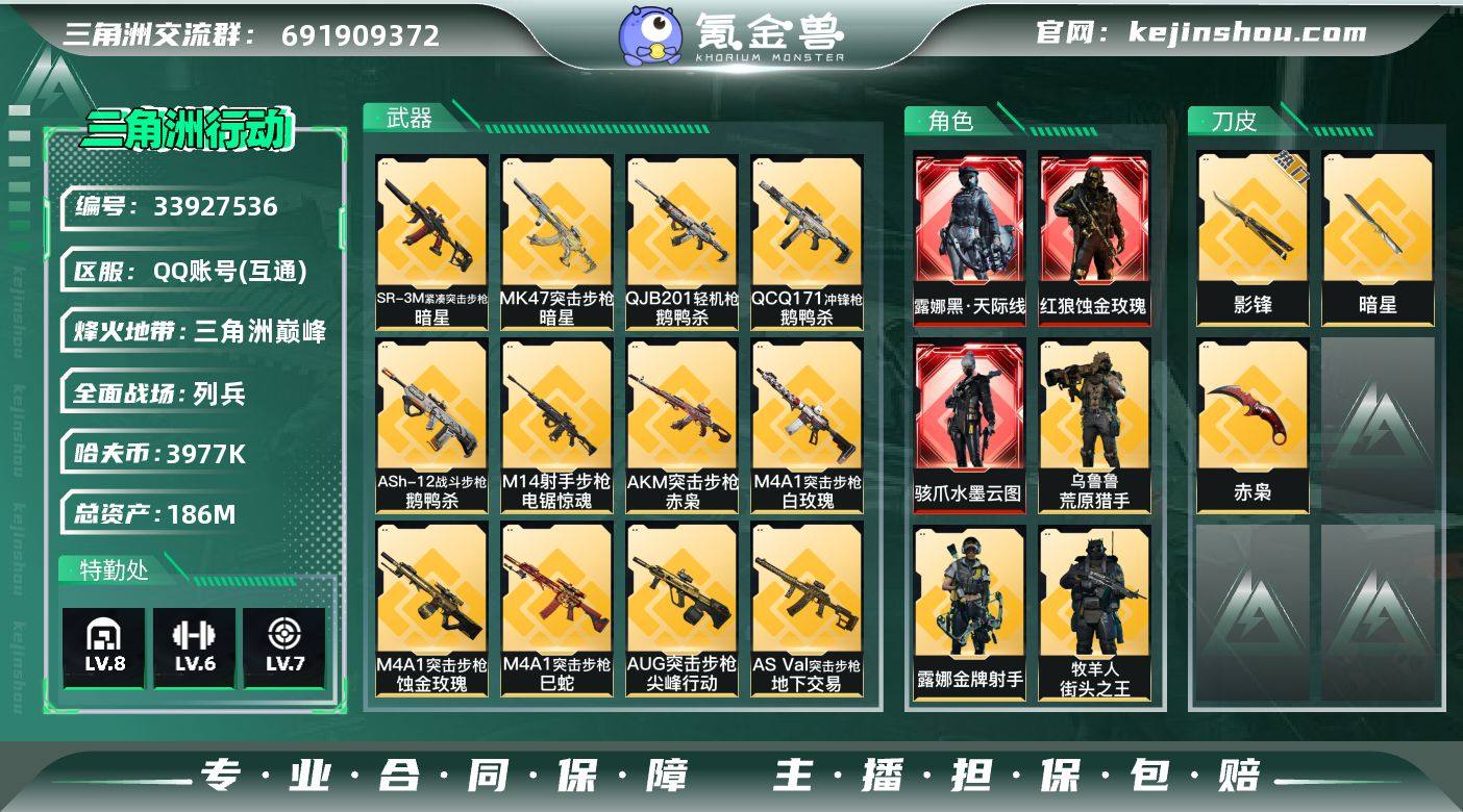 【赛季热门组合-三红+三红+铁面+蛟龙特战队】【【无二次协助处理】】-特勤处:仓库8级/靶场7级/训练中心6级-186m总资产-3977k哈伏币-60烽火等级-三角洲巅峰-28战场等级-列兵 【干员外观】:红狼-蚀金玫瑰,骇爪-水墨云图,露娜-黑·天际线,威龙-铁面判官,威龙-壮志凌云,威龙-蛟龙特战队,蜂医-送葬人·无题密令,牧羊人-街头之王,无名-夜鹰,露娜-金牌射手,乌鲁鲁-荒原猎手 【近战皮肤】:近战-暗星,近战-影锋,近战-赤枭,近战-黑鹰 【传说外观】:M4A1突击步枪-白玫瑰,M4A1突击步枪-蚀金玫瑰,M4A1突击步枪-巳蛇,M4A1突击步枪-阿米娅,AKM突击步枪-赤枭,QBZ95-1突击步枪-破军,ASh-12战斗步枪-鹅鸭杀,K416突击步枪-尖峰行动,K416突击步枪-白鹰军团,K416突击步枪-行动记录,AUG突击步枪-尖峰行动,M7战斗步枪-神秘艺术,M7战斗步枪-白玫瑰,M7战斗步枪-怜悯,M7战斗步枪-维京,M7战斗步枪-巳蛇,SG552突击步枪-白鹰军团,SG552突击步枪-运动员,AK-12突击步枪-夜鹰,AK-12突击步枪-特斯拉线圈,SCAR-H战斗步枪-地下交易,SCAR-H战斗步枪-铁艺苍穹,SCAR-H战斗步枪-水墨云图,SCAR-H战斗步枪-启航,CAR-15突击步枪-阿米娅,AS Val突击步枪-地下交易,腾龙突击步枪-...