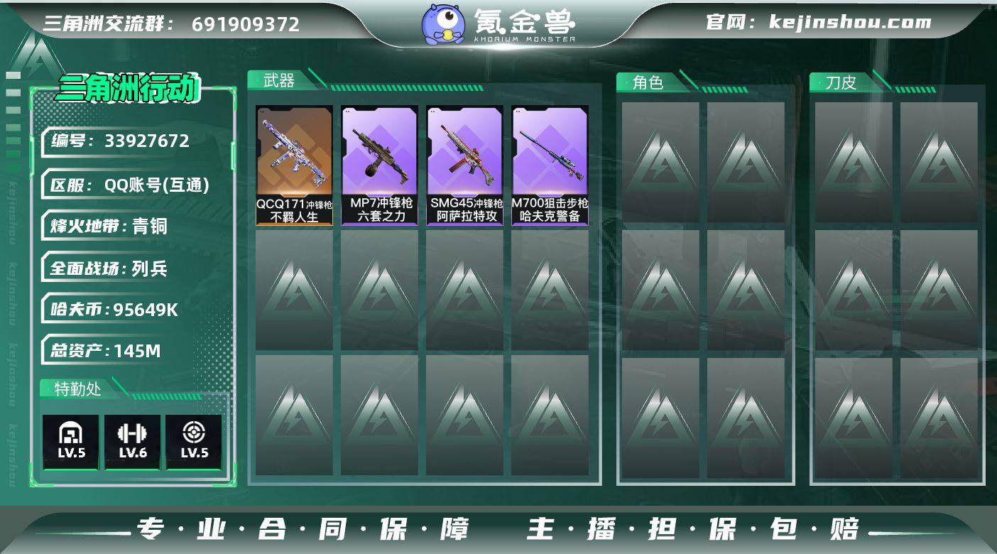 【sjs11341】包人脸 疯狂猛攻号 sjs11341 145m总资产-95649k哈夫币-60烽火等级-青铜-9战场等级-列兵 【近战皮肤】:近战-黑鹰 【传说外观】:QCQ171冲锋枪-不羁人生 【史诗外观】:SMG-45冲锋枪-阿萨拉特攻,MP7冲锋枪-六套之力,M700狙击步枪-哈夫克警备 【稀有外观】:R93狙击步枪-精湛工艺, AK-12突击步枪-马年新春,MP5冲锋枪-哈夫克卫队,SMG-45冲锋枪-行动开启,SKS射手步枪-弄臣,QSZ92G-一帆风顺 【普通外观】:M4A1突击步枪-粉色涂装,M4A1突击步枪-高雅黑,M4A1突击步枪-海色,QBZ95-1突击步枪-高雅黑,QBZ95-1突击步枪-海浪,QBZ95-1突击步枪-海色,K416突击步枪-高雅黑,M16A4突击步枪-出货,M7战斗步枪-红色涂装,SG552突击步枪-浅蓝涂装,SG552突击步枪-狂欢,SCAR-H战斗步枪-数码迷彩,CAR-15突击步枪-狂欢,MP5冲锋枪-黄蜂,SR-3M紧凑突击步枪-三角洲力量,M1014霰弹枪-高雅黑,M1014霰弹枪-重击,杠杆式步枪-出货,PKM通用机枪-出货,QJB201轻机枪-典雅,QJB201轻机枪-玲珑,SVD狙击步枪-高雅黑,SR-25射手步枪-黑巧甜心,SR9射手步枪-出货,SV-98狙击步枪-红色涂装 【挂饰】:挂饰-隐者*2,挂饰-审判,挂饰-麻将,挂饰-星象仪*7