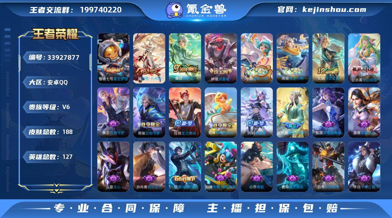 安卓Q-V6-尊贵铂金II段位-127英雄-188皮肤-1典藏皮肤-2传说-50史诗 【英雄全皮】:刘禅全皮,敖隐全皮,空空儿全皮 【荣耀典藏】:鲁班七号星空梦想 【传说皮肤】:澜愿照九州拓,桑启鸣野蒿 【限定皮肤】:蒙犽顽岩魄,大乔绒语心约,姜子牙天穹之誓,狄仁杰阴阳师,赵云皇家上将,孙尚香蔷薇恋人,庄周高山流水,元歌无心,狄仁杰魔术师,项羽海滩派对,阿古朵江河有灵,张良古海寻踪,鬼谷子天穹祈灯,李元芳蔬乡物语,刘邦剑破天穹,周瑜熔金海岸 【年限皮肤】:澜愿照九州拓 【赛季限定】:张良古海寻踪,鬼谷子天穹祈灯,刘邦剑破天穹,姜子牙天穹之誓,东皇太一噬灭天穹,太乙真人谧流熔炉,钟馗虚灵犬护,甄姬逆浪荇歌,亚瑟荣光之誓 【战令限定】:李元芳蔬乡物语,刘禅鸭鸭历险记,沈梦溪鸭鸭历险记,周瑜百相守梦,孙策百相守梦,周瑜线条小狗,小乔线条小狗 【史诗皮肤】:钟馗锁墨魂,周瑜线条小狗,小乔线条小狗,女娲万灵启世,公孙离涂山容容,黄忠百相守梦,周瑜百相守梦,狂铁龙之律动,刘禅鸭鸭历险记,阿轲化蝶舞,赵怀真器灵浮梦炉,姬小满战舞者,蒙犽顽岩魄,阿古朵江河有灵,镜真我赫兹,刘禅电玩爆裂旋风,元歌无心,庄周高山流水,钟馗乐园奇幻夜,...