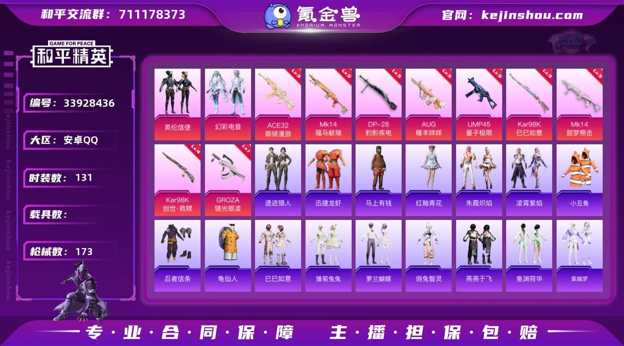 【kyhp1860】安卓 手Q-2粉装-9特效枪-0载具-0粉色飞行器-45288热力值-5王牌印记-131套装-173枪皮 【热门品类】:套装-小丑鱼,套装-忍者信条,套装-龟仙人 【粉色套装】:粉装-英伦信使,粉装-幻彩电音 【粉色枪皮等级】:GROZA-镜光银凌(一级),AUG-暖羊咩咩(五级),ACE32-萌骑漫游(五级),UMP45-量子极限(五级),Kar98K-创世·救赎(四级),Kar98K-巳巳如意(五级),Mk14-甜梦熊击(五级),Mk14-福马献瑞(五级),DP-28-豹影疾电(五级) 【粉色枪皮】:GROZA-镜光银凌,AUG-暖羊咩咩,ACE32-萌骑漫游,UMP45-量子极限,Kar98K-创世·救赎,Kar98K-巳巳如意,Mk14-甜梦熊击,Mk14-福马献瑞,DP-28-豹影疾电 【粉色降落伞】:BEARBRICK降落伞,月影灵韵降落伞,罪夜之冕降落伞 【稀有套装】:套装-龟仙人,套装-巳巳如意,套装-马上有钱,套装-迅捷龙虾,套装-遗迹猎人,套装-雏菊兔兔,套装-萝兰蝴蝶,角色-俏兔智灵,套装-燕燕于飞,套装-鱼渊荷华,套装-紫幽梦,套装-蓝冰羽,套装-云朵鹅,套装-雪绒豹,套装-朱霞炽焰,套装-凌霄紫焰,套装-雨过天青,套装-红釉青花 【稀有枪皮】:AKM-彩虹符号,AKM-影袭,AKM-破晓战魂,AKM-缤纷海域,AKM-虎虎生威,AKM-龙的传人,M16A4-幻世...