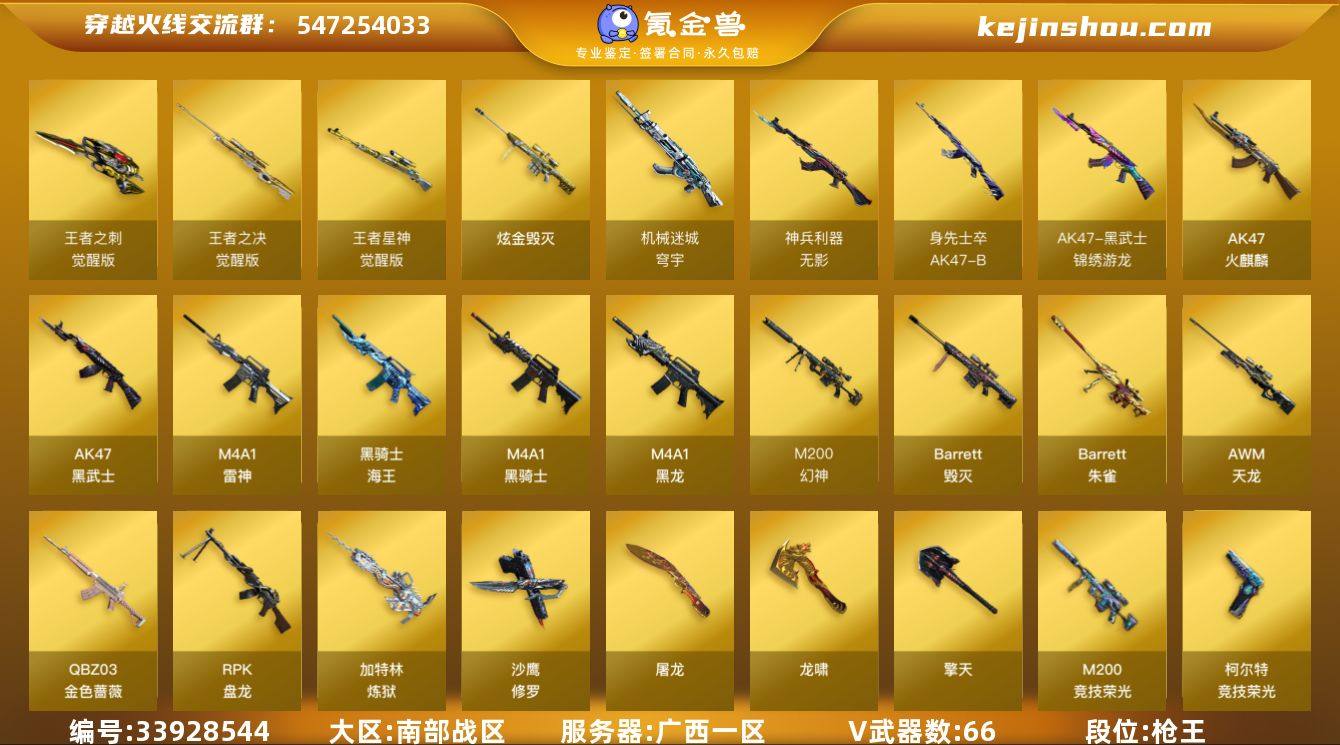 广西一区-70V-3王者武器数-1炫金武器数 【热门武器】:QBZ03-金色蔷薇,M200-幻神,M200-竞技荣光,死亡之眼,柯尔特-冠军之特,M4A1-黑骑士,RPK-盘龙,加特林-炼狱,USP-雷暴,沙鹰-修罗*2,金刚伞 【王者炫金武器】:炫金毁灭 【音效卡】:AK47-火麒麟音效卡,M4A1-雷神音效卡,M4A1-黑骑士音效卡,70KG语音包 【皮肤】:雷神-暗月,雷神-耀金皮肤,雷神-冠军之魄,雷神-神秘按键 皮肤,火麒麟-雷神,火麒麟-轻羽皮肤,毁灭-暗月,毁灭耀金皮肤,毁灭-英雄计划 皮肤,M4A1-千变-孔明皮肤,黑骑士-暗月,黑武士-典韦皮肤,战神-粉色甜心皮肤*2,战神-紫绶金章皮肤,战神-流金岁月皮肤*3,AK47-B-常胜将军-曹操,AK47-B-常胜将军-刘备,AK47-B-常胜将军-孙权,修罗-星空*2 【角色】:电竞教官-云悠悠,零·纪元,王者-瞳-闭月羞花,王者春,王者玲珑-小乔,奇洋探员,乔伊教练,修道士,云海玲珑,斗烈龙骑,暗夜-X,北极狐-X,电竞少女,芳心审判者,嘉年华灵狐,娟娟,0号玩家,龙儿,萌儿,蜀雪,铁骑荣耀,影武者-X,游珑儿,职业选手 【人偶武器】:AWM-灵狐-15周年嘉年华,闪光弹-小乔,闪光弹-貂蝉,高爆手雷-大乔 【暴走生化】:死亡之眼 【挑战大师】:冰龙粉碎者-白...