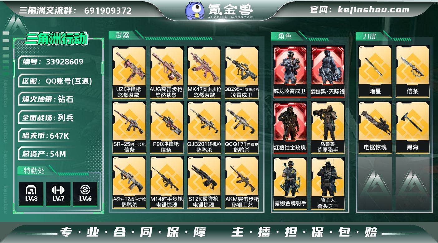 【sjs10544】包人脸 玩够可回血 3刀皮3红皮 带彦祖 sjs10544 54m总资产-647k哈夫币-60烽火等级-钻石-36战场等级-列兵 【干员外观】:红狼-蚀金玫瑰,露娜-黑·天际线,威龙-凌霄戍卫,威龙-壮志凌云,威龙-飞虎,蜂医-送葬人·无题密令,牧羊人-街头之王,无名-夜鹰,深蓝-不破誓约,红狼-电锯惊魂,露娜-金牌射手,乌鲁鲁-荒原猎手 【近战皮肤】:近战-暗星,近战-信条,近战-黑海,近战-电锯惊魂,近战-处刑者2级,近战-黑鹰 【传说外观】:M4A1突击步枪-蚀金玫瑰,M4A1突击步枪-阿米娅,AKM突击步枪-秘银工艺,QBZ95-1突击步枪-凌霄戍卫,ASh-12战斗步枪-鹅鸭杀,K416突击步枪-行动记录,AUG突击步枪-悠然茶歇,M7战斗步枪-怜悯,M7战斗步枪-维京,SG552突击步枪-运动员,AK-12突击步枪-夜鹰,AK-12突击步枪-特斯拉线圈,SCAR-H战斗步枪-铁艺苍穹,SCAR-H战斗步枪-启航,SCAR-H战斗步枪-荼蘼,G3战斗步枪-骑士,CAR-15突击步枪-阿米娅,腾龙突击步枪-捞点薯条,腾龙突击步枪-万金泪冠,KC17突击步枪-电锯惊魂,MK47突击步枪-悠然茶歇,MP5冲锋枪-黑海,P90冲锋枪-信条,UZI冲锋枪-特斯拉线圈,UZI冲锋枪-悠然茶歇,SMG-45冲锋枪-骑士,SR-3M紧凑突击步枪-特斯拉线圈,SR-3M紧...