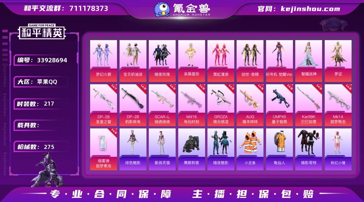 苹果 手Q-9粉装-10特效枪-0载具-3粉色飞行器-90675热力值-18王牌印记-217套装-275枪皮 【热门品类】:粉装-梦幻火箭,套装-小丑鱼,套装-龟仙人,套装-暗影哥特,套装-粉红小猪,角色-Mark.06 【粉色套装】:粉装-宝贝奶油派,粉装-梦幻火箭,粉装-暗夜玫瑰,角色-呆萌星弥,粉装-霓虹漫游,套装-创世·救赎,角色-初号机 觉醒Ver.,角色-智耀战神,角色-罗征 【粉色枪皮等级】:SCAR-L-锦绣绵绵(五级),M416-电玩时刻(五级),GROZA-镜光银凌(五级),AUG-暖羊咩咩(五级),UMP45-量子极限(五级),Kar98K-巳巳如意(五级),Mk14-甜梦熊击(五级),DP-28-圣堂之誓(七级),DP-28-豹影疾电(五级),烟雾弹-甜梦果泡(五级) 【粉色枪皮】:SCAR-L-锦绣绵绵,M416-电玩时刻,GROZA-镜光银凌,AUG-暖羊咩咩,UMP45-量子极限,Kar98K-巳巳如意,Mk14-甜梦熊击,DP-28-圣堂之誓,DP-28-豹影疾电,烟雾弹-甜梦果泡 【粉色飞行器】:炫彩糖果飞行器,沙丘之主天马,霓虹漫游飞行器 【粉色降落伞】:天启纪元降落伞,洛神天依降落伞,垂柳戏鸭降落伞,白勺歌姬降落伞,镜域双华降落伞,霓虹漫游降落伞,宇宙意志降落伞,时空协奏降落伞,拳皇·狂花道降落伞,临安公主降落伞,脆鲨七海降落伞,鬼...