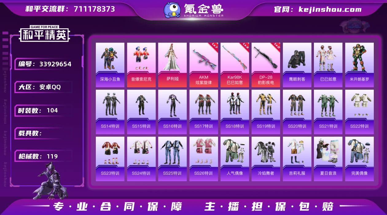 安卓手Q-2粉装-3特效枪-35637热力值-4王牌印记-104套装-119枪皮 【热门品类】:粉装-音爆索尼克,套装-深海小丑鱼 【粉色套装】:粉装-音爆索尼克,角色-萨利娅 【粉色枪皮等级】:AKM-炫紫旋律(七级),Kar98K-巳巳如意(三级),DP-28-豹影疾电(二级) 【粉色枪皮】:AKM-炫紫旋律,Kar98K-巳巳如意,DP-28-豹影疾电 【粉色降落伞】:怪笑疯兔降落伞,仲夏莫吉托降落伞,未来歌姬降落伞,月影灵韵降落伞 【稀有套装】:套装-巳巳如意,角色-米开朗基罗 【稀有枪皮】:AKM-夜灯,AKM-彩虹符号,AKM-影袭,AKM-破晓战魂,AKM-萌趣颜团子,AKM-虎虎生威,AKM-霓虹街区,AKM-龙的传人,M16A4-幻世战舞者,M16A4-红色方程式,M16A4-蓝色火焰,SCAR-L-炫彩节奏,SCAR-L-玉兔迎春,SCAR-L-红色方程式,M416-夜灯,M416-糯团青竹,M416-红色方程式,M416-蓝色火焰,GROZA-彩虹符号,GROZA-田园牧歌,AUG-天降萌叽,AUG-幻影战神,AUG-耀粉歌者,QBZ-彩虹符号,QBZ-银碳小老虎,M762-天降萌叽,M762-彩虹符号,M762-牛气冲天,Mk47-妙红点点,AC-VAL-天降萌叽,蜜獾-垂柳戏鸭,蜜獾-天降萌叽,蜜獾-娇憨猪猪,UZI-天降萌叽,UZI-娇憨猪猪,UZI-炫彩节奏,UZI-红色方程式,UMP45-生命誓言...