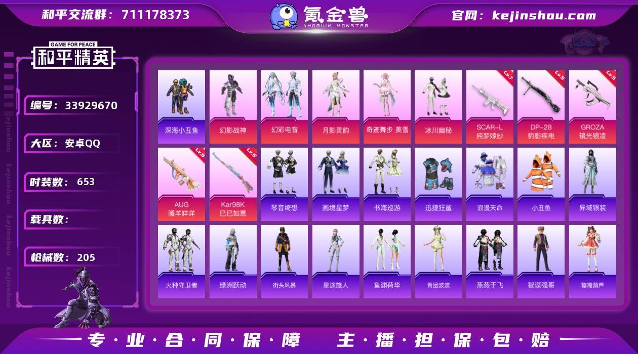 【特价出售】安卓Q-2稀有5粉装8特效枪9热门163套装205枪皮 63623热力值 7印记 历史超级王牌14星 【2稀有】 AKM-缤纷海域 浪漫天命 【5粉装】 奇迹舞步美雪 月影灵韵 幻影战神 幻彩电音 冰川幽秘 【8特效枪】 SCAR-L-纯梦嫁纱 (7级) Kar98K-巳巳如意 (5级) DP-28-豹影疾电 (5级) AUG-暖羊咩咩 (5级) GROZA-镜光银凌 (5级) 信号枪-金乌曜日 (2级) Mk14-福马献瑞 (5级) ACE32-萌骑漫游 (3级) 【9热门】 小丑鱼 龟仙人 迅捷狂鲨 深海小丑鱼 TT战队服 忍者信条 漫步者 极速红龙 弄潮海豚 【1飞行器】 纯梦嫁纱飞行翼 【5头盔】 梦幻火箭头盔 幻影战神头盔 深海小丑鱼头盔 金羽特工头盔 甜蜜誓约头盔 【3背包】 梦幻火箭背包 幻影战神背包 金羽特工背包
