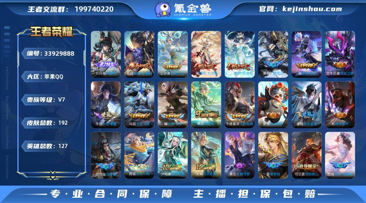 苹果Q-V7-尊贵铂金III段位-127英雄-192皮肤-1无双-15传说-60史诗 【英雄全皮】:孙权全皮 【无双皮肤】:公孙离离恨烟 【传说皮肤】:马超神骥逐星野,公孙离云诺千山,妲己愿照众生和,澜愿照九州拓,桑启鸣野蒿,夏侯惇霜北刀,澜逐花归海,马超无双飞将,铠绛天战甲,曜云鹰飞将,李信一念神魔,干将莫邪久胜战神,虞姬云霓雀翎,梦奇胖达荣荣,宫本武藏地狱之眼 【限定皮肤】:公孙离离恨烟,夏侯惇霜北刀,暃埋骨钱,蒙犽顽岩魄,大乔绒语心约,姜子牙天穹之誓,李白谪仙醉月,狄仁杰阴阳师,赵云皇家上将,孙尚香蔷薇恋人,元歌无心,狄仁杰魔术师,项羽海滩派对,露娜一生所爱,裴擒虎李小龙,嫦娥拒霜思,西施玲珑珍味,西施至美乘鲤谣,鲁班大师探海日志,艾琳流音漫舞,司空震地狱燃心,阿古朵江河有灵,张良古海寻踪,蒙犽百解令,高渐离燃音魔法,妲己灵卜魔法,鬼谷子天穹祈灯,沈梦溪龙舞盛年,鲁班七号蔬乡物语,李元芳蔬乡物语,刘邦剑破天穹,程咬金群星魔术团,镜青焰无极,项羽苍威无极,刘备异域游侠,芈月浮光幕影,周瑜熔金海岸 【年限皮肤】:妲己愿照众生和,澜愿照九州拓 【赛季限定】:鲁班大师探海日志,张良古海寻踪,鬼谷子天穹祈灯,刘邦剑破天...