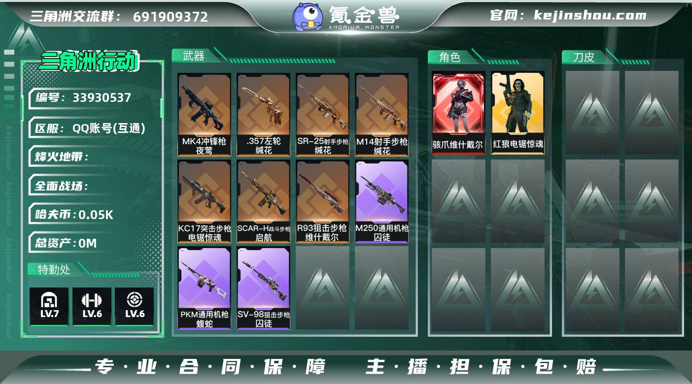 【包人脸】126M 57W哈夫币 60-烽火等级 32-三角币和劵 71级通行证 5-战场等级 【近战武器】 黑鹰 【干员外观】 骇爪-维什戴尔 红狼-电锯惊魂 【套装】 维什戴尔套 【传说枪皮】 R93狙击步枪-维什戴尔 SCAR-H战斗步枪-启航 MK4冲锋枪-夜莺 M14射手步枪-缄花 SR-25射手步枪-缄花 .357左轮-缄花 KC17突击步枪-电锯惊魂 【史诗枪皮】 PKM通用机枪-蝮蛇 M250通用机枪-囚徒 SV-98狙击步枪-囚徒 Vector冲锋枪-阿萨拉文明