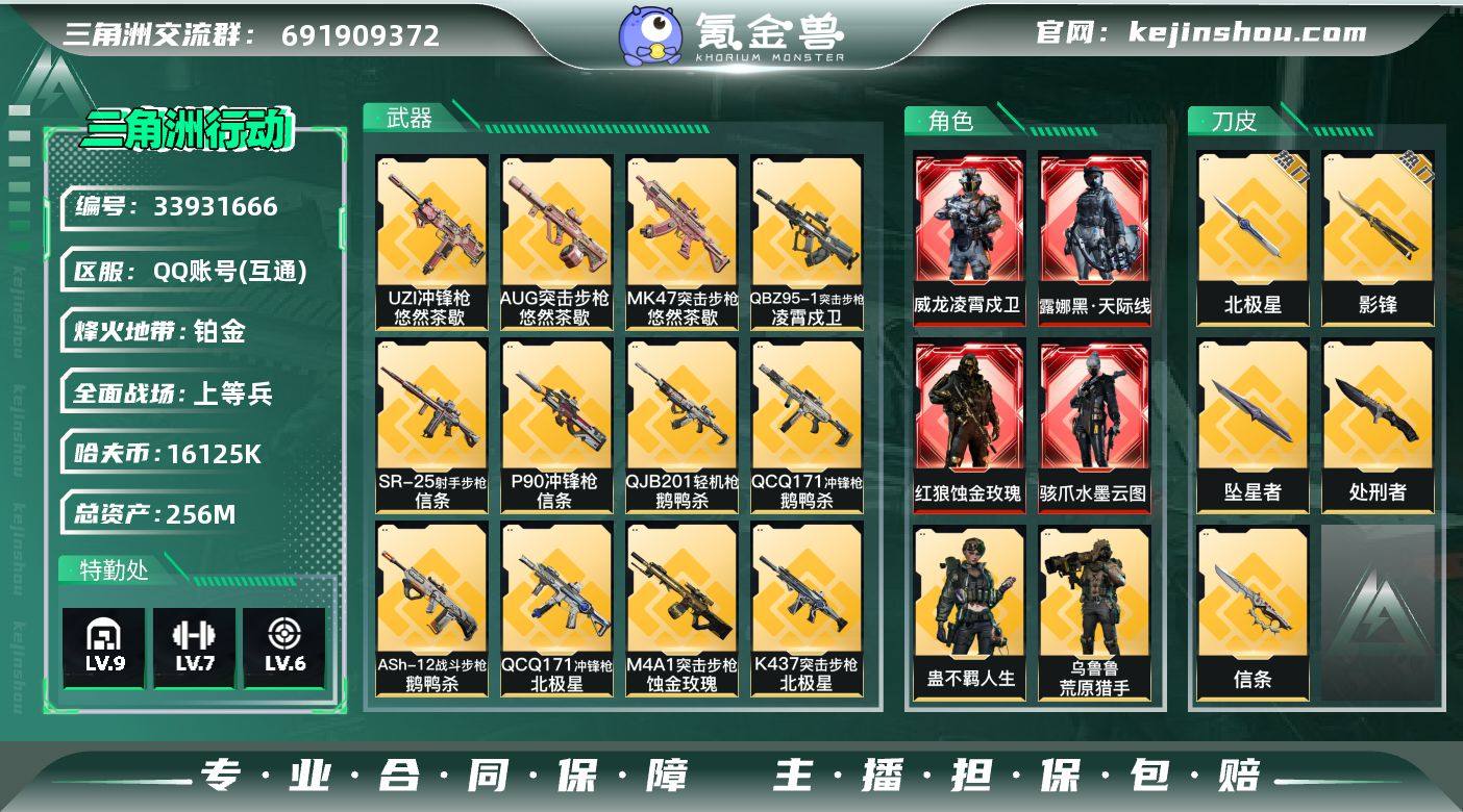 256m总资产-16125k哈夫币-60烽火等级-铂金-34战场等级-上等兵 【干员外观】:红狼-蚀金玫瑰,骇爪-水墨云图,露娜-黑·天际线,威龙-凌霄戍卫,蜂医-送葬人·无题密令,深蓝-不破誓约,红狼-电锯惊魂,露娜-金牌射手,乌鲁鲁-荒原猎手,蛊-不羁人生 【近战皮肤】:近战-坠星者,近战-北极星,近战-信条,近战-影锋,近战-处刑者1级,近战-黑鹰 【传说外观】:M4A1突击步枪-蚀金玫瑰,M4A1突击步枪-阿米娅,AKM突击步枪-锦绣,QBZ95-1突击步枪-凌霄戍卫,ASh-12战斗步枪-鹅鸭杀,K416突击步枪-行动记录,AUG突击步枪-悠然茶歇,AUG突击步枪-西装暴徒,SG552突击步枪-运动员,AK-12突击步枪-特斯拉线圈,SCAR-H战斗步枪-水墨云图,SCAR-H战斗步枪-启航,G3战斗步枪-骑士,CAR-15突击步枪-阿米娅,腾龙突击步枪-捞点薯条,腾龙突击步枪-马年祥瑞,K437突击步枪-北极星,K437突击步枪-锦绣,KC17突击步枪-电锯惊魂,MK47突击步枪-悠然茶歇,P90冲锋枪-信条,Vector冲锋枪-能天使-午夜邮差,UZI冲锋枪-特斯拉线圈,UZI冲锋枪-悠然茶歇,SMG-45冲锋枪-锦绣,SR-3M紧凑突击步枪-特斯拉线圈,勇士冲锋枪-能天使-午夜邮差,QCQ171冲锋枪-北极星,QCQ171冲锋枪-鹅鸭杀,QCQ171冲锋枪-不羁...