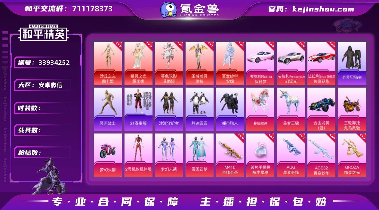 编号24030 安V售后,地铁满天赋,战神框,32印记,5级图卡盟,3级露米娜,瑞拉, 艾丽娅,安妮,螳螂,木乃伊,S1,金鞋子,十周年,黑丝,洛天依,新101,雪国,猪妹,碟中谍,都市,第五大道,5级法拉利,星梦玉骢,满级至情至圣,7级星梦奇缘,沙丘之主,精灵之光,百变纱华,暮色玫影,19载具,40粉5红,42特17满6计数26淘汰,送璀璨碎片