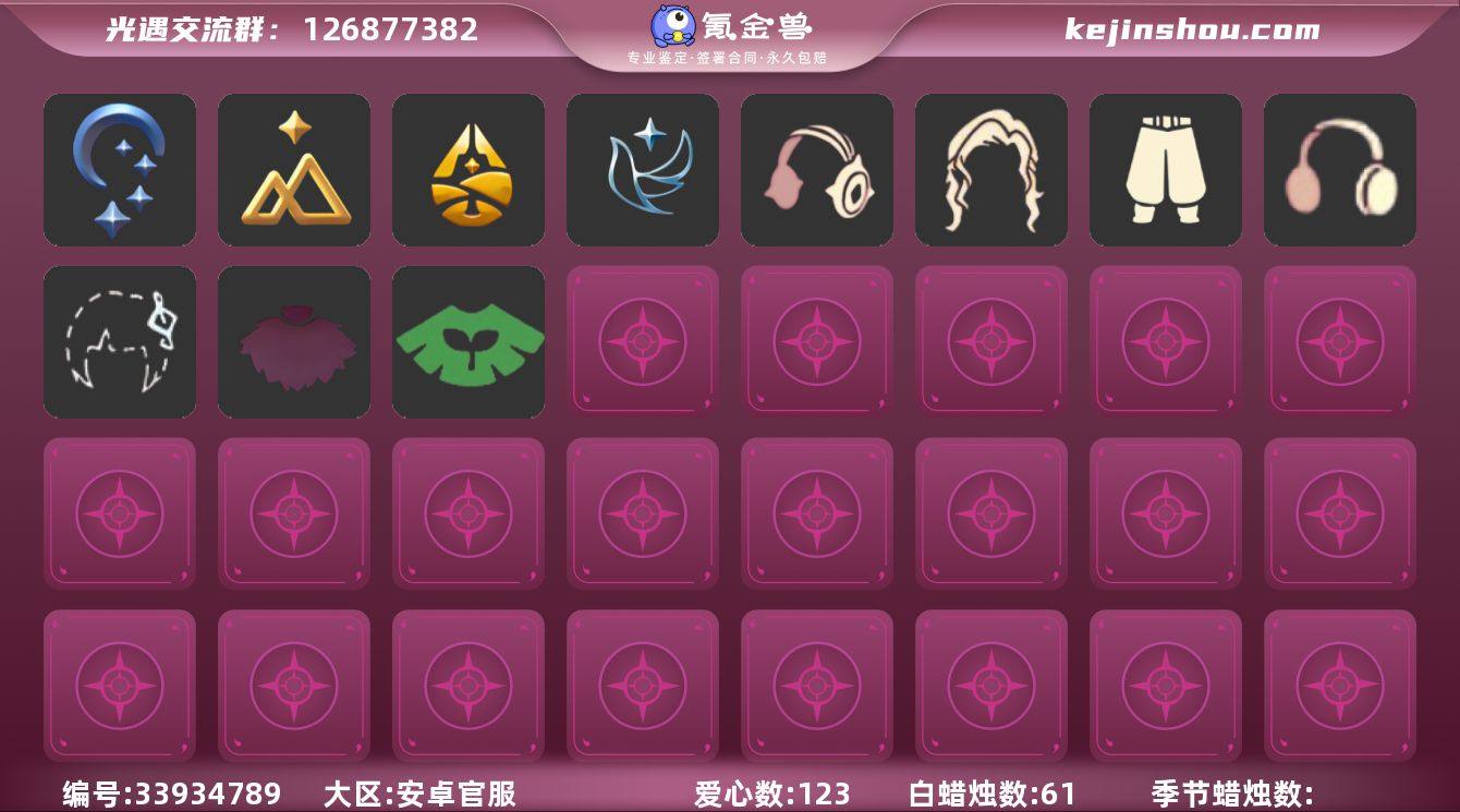 安卓官服5季巫师帽武士裤虚荣 【毕业图】霞谷 【毕业季】夜行季,拾光季,归巢季,九色鹿,青鸟季 【蜡烛】61 【爱心】123 身高1.72-13.72 当前1.92 【稀有礼包】跃动跑鞋,星月头冠,彩虹耳机,巫师帽,雪花发夹,创始人斗篷 【毕业物品】棕熊面具,绒毛斗篷,西部帽,粗框眼镜,季卡相机,五塑彩带斗,五塑彩羽发,九色鹿飞天斗篷,九色鹿丝带裤,九色鹿丸子头,青鸟斗篷,青鸟面饰 【热门复刻】星星面具,樱花发型,逍遥发型,绿芽,武士裤,虚荣,正太头,猫猫头,花环长发,红耳机,箬笠,平顶帽,雨伞,白金斗篷,黑金斗篷,红金斗篷,黄鼠狼面具,疯帽匠发型,女巫发型,蓝色音乐会,书虫发型,五周年裤子,道袍 【光之翼】123