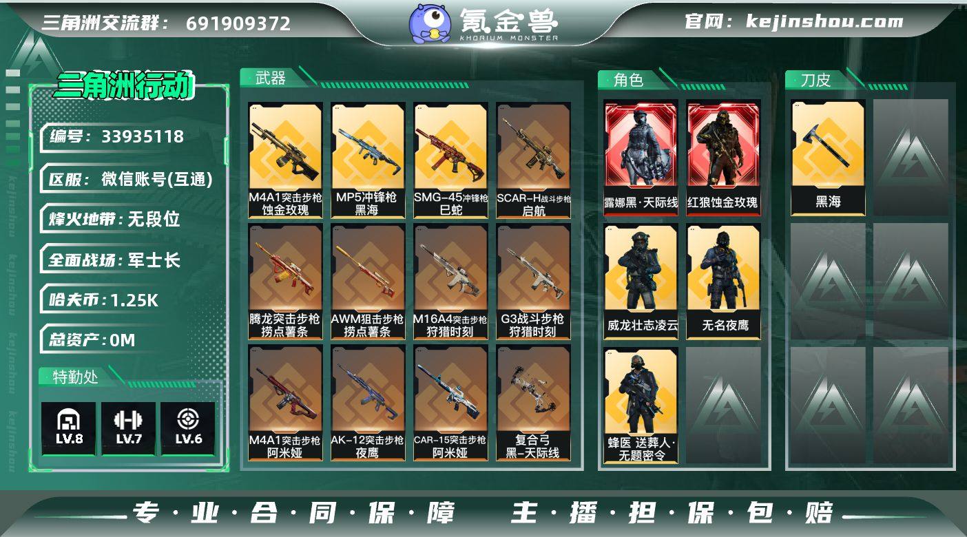 【SJQQ138】总资产159M/哈夫币125万/传说近战数1/传说枪皮数36/战场等级50/行动等级60/安全箱等时效性道具以游戏内数据为准,详情请看图/红狼-蚀金玫瑰/露娜-黑·天际线/威龙-壮志凌云S3/蜂医-送葬人·无题密令(S5)/无名-夜鹰S4/红狼-电锯惊魂/露娜-金牌射手/乌鲁鲁-荒原猎手/蛊-不羁人生/近战-黑海/近战-处刑者1级/黑鹰/M4A1突击步枪-蚀金玫瑰/M4A1突击步枪-阿米娅/M16A4突击步枪-狩猎时刻/AUG突击步枪-悠然茶歇/SG552突击步枪-运动员/AK-12突击步枪-夜鹰/SCAR-H战斗步枪-铁艺苍穹/SCAR-H战斗步枪-启航/SCAR-H战斗步枪-荼蘼/G3战斗步枪-狩猎时刻/CAR-15突击步枪-阿米娅/腾龙突击步枪-捞点薯条/腾龙突击步枪-万金泪冠/KC17突击步枪-电锯惊魂/47突击步枪-悠然茶歇/MP5冲锋枪-黑海/Vector冲锋枪-狩猎时刻/UZI冲锋枪-悠然茶歇/SMG45冲锋枪-骑士/SR-3M紧凑突击步枪-荼蘼/勇士冲锋枪-能天使-午夜邮差/勇士冲锋枪-万金泪冠/QCQ171冲锋枪-不羁人生/725双管霰弹枪-送葬人-无题密令/PKM通用机枪-荼蘼/QJB201轻机枪-黑海/M14射手步枪-蛮荒/M14射手步枪-缄花/SKS射手步枪-骑士/SR-25射手步枪-水墨云图/SR-25射手步枪-缄花/AWM狙击步枪-捞点薯条/AWM狙击步枪-万金泪冠/.357左轮-缄花/93R-捞...