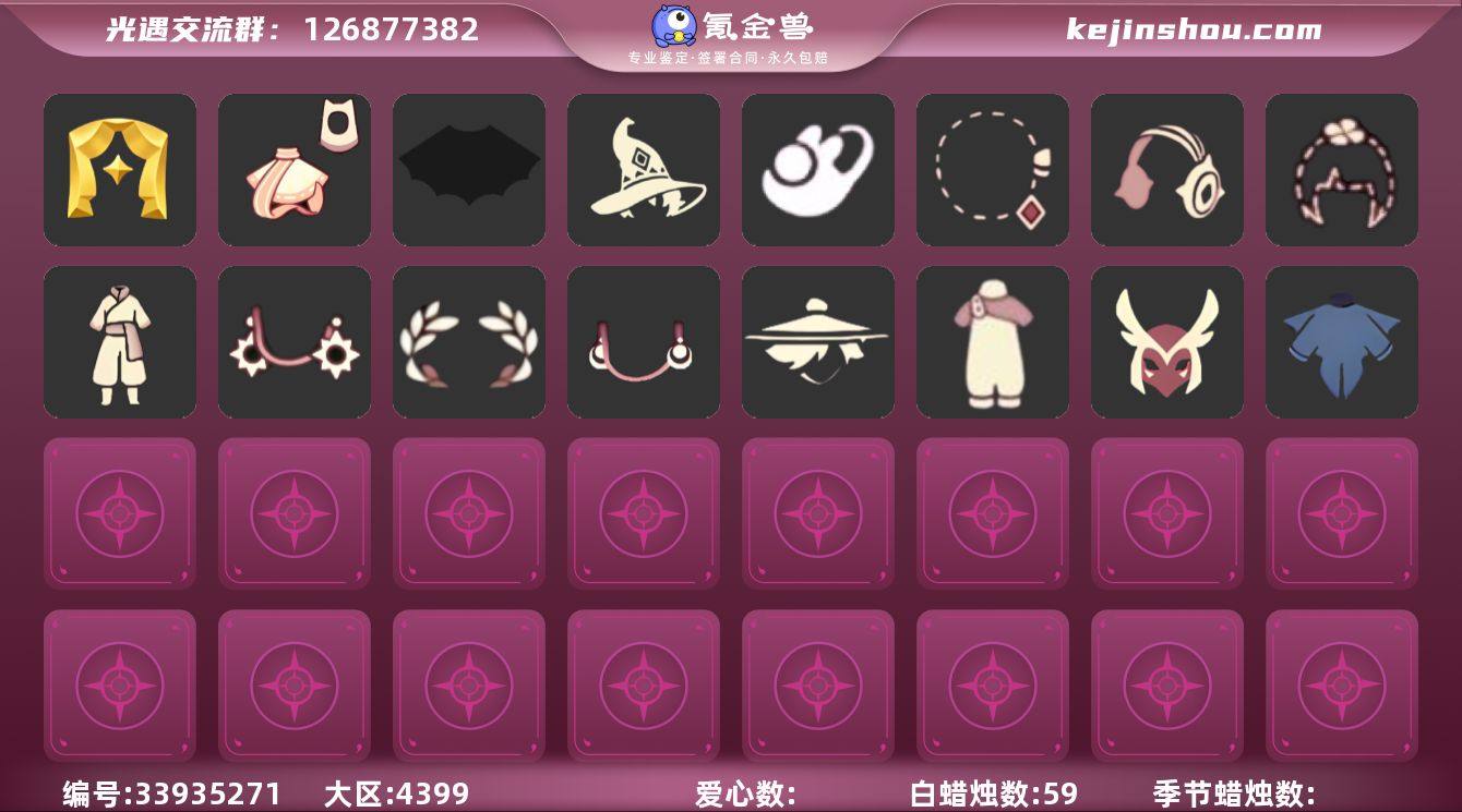 安卓官服 邮箱账号 1珍稀物品 3毕业季 1毕业图 59蜡烛 【珍稀物品】白枭(帝企鹅发) 【季节已毕业】表演季,双星季,迁徙季 【完成地图】霞谷 【礼包】兔子鞋(兔子拖鞋),暗彩装扮(彩虹武士裤),巫师(巫师帽),锦标赛桂冠,四叶草(四叶草头饰),彩虹耳钉(彩虹耳饰),彩虹耳机,日光耳环,满月耳坠,蝙蝠套(蝙蝠斗篷)(南瓜头),风之旅人白袍(超凡风之旅人礼包),南瓜(冥龙南瓜) 【裤子】背带裤 【面具】黄眉企鹅面具 【发型】若笠(箬笠) 【斗篷】燕尾斗篷