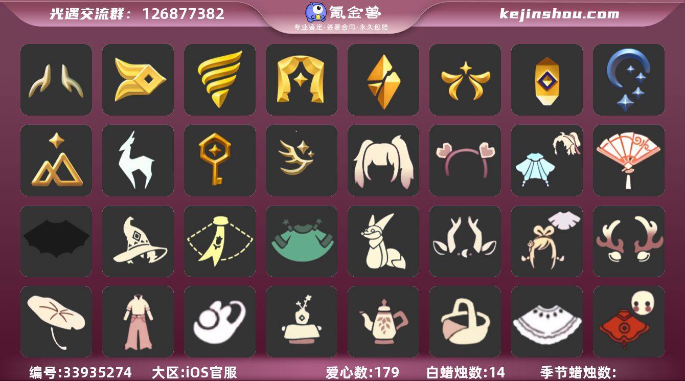 账号类型: 邮箱账号 季节已毕业: 风行季,潜海季,表演季,破晓季,欧若拉季,夜行季,追忆季,拾光季,九色鹿季,筑巢季,迁徙季,织光季 完成地图: 晨岛,云野,雨林,霞谷,暮土,禁阁 珍稀物品: 白枭,透明蝶翼斗 礼包: 蝙蝠套,巫师,围巾,星球斗,小狐狸,九色鹿角,绊爱,鹿角,荷叶伞,牛仔裤,兔子鞋,茶桌,茶壶,餐桌,白绒金,福娃,吉他,橘子,贝壳,兔子,星月头饰,新年裤,蝴蝶结,四叶草,小提琴,雪人鞋,新年耳钉,创始人,锦标赛桂冠,献瑞折扇礼包,渐变双马尾发型礼包,心心相印发饰礼包,青衫落拓礼包 裤子: 武士裤,背带裤,搓澡巾,蓝绿裤,筑巢季·裤子,风行毕业裤子 面具: 裂纹面具,呼吸面具,夜行毕业面具,黄眉企鹅面具 面饰: 红耳机,黑框眼镜 项链: 围巾 发型: 若笠,虚荣,单侧绑发,留辫蘑菇头,飞天盘发 头饰: 羽毛发饰,牛仔帽,蓝色音乐会,平顶帽 斗篷: 黄色蓑衣,海洋斗,绿芽,粉红绒毛斗篷,遥鲲斗篷,燕尾斗篷,冥龙斗篷,领主红斗篷 配饰: 筑巢季·小手办,高音钢琴,相机,鲲灯 亮点: 【优质装备】:表演季,白枭(帝企鹅发),武士裤,风行季,潜海季,破晓季,透明蝶翼斗,欧若拉季(欧若拉),羽毛发饰(多羽发饰),筑巢季·小手办(光之子试衣),高音钢琴(白色高脚钢琴),夜行季,追忆季,牛仔帽(西部帽),相机(季卡相机),拾光...