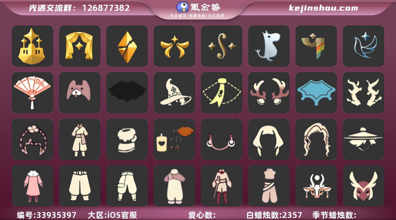 iOS官服 手机账号 2珍稀物品 10毕业季 3毕业图 2357蜡烛 【珍稀物品】白枭(帝企鹅发),透明蝶翼斗 【季节已毕业】梦想季,表演季,破晓季,欧若拉季(欧若拉),二重奏季,姆明季,彩染季,青鸟季,双星季,迁徙季 【完成地图】雨林,霞谷,墓土(暮土) 【礼包】雪人鞋(圣诞雪人靴),暗彩装扮(彩虹武士裤),姆明饰品套装(姆明尾巴),巫师(巫师帽),小狗周年发饰(小狗周年头饰),四叶草(四叶草头饰),满月耳坠,枯角(巫树犄角),鹿角(圣诞鹿角),创始人(创始人斗篷),围巾(小王子斗篷)(小王子围巾),蝙蝠套(蝙蝠斗篷)(南瓜头),瑞雪(瑞雪斗篷)(暖冬瑞雪),青衫落拓礼包,献瑞折扇礼包 【裤子】妮妮裙子(妮妮长裙),蓝绿裤(高领舞服),武士裤,背带裤,搓澡巾,击剑裤 【面具】黄眉企鹅面具,辉光羚羊面具,凤凰面具 【面饰】青鸟毕业面饰(青鸟面饰) 【发型】留辫蘑菇头,虚荣,若笠(箬笠) 【头饰】平顶帽,蓝色音乐会(蓝色音乐符) 【斗篷】瑞雪斗篷,冥龙斗篷,燕尾斗篷,遥鲲斗篷(双翼遥鲲斗),彩染围巾斗篷,青鸟毕业斗篷(青鸟斗篷),绿芽,黄色蓑衣(道袍),蟑螂斗(凤凰斗篷),海洋斗 【配饰】小红伞(姆明红伞)(姆明大伞),姆明抱枕,雨伞,高音钢琴(白色高脚钢琴)