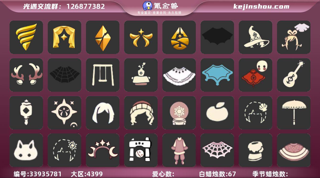 安卓官服 手机账号 3珍稀物品 5毕业季 6毕业图 67蜡烛 【珍稀物品】白枭(帝企鹅发),透明蝶翼斗,彩虹围巾(五塑彩带斗) 【季节已毕业】潜海季,表演季,破晓季,欧若拉季(欧若拉),归巢季 【完成地图】晨岛,云野,雨林,霞谷,墓土(暮土),禁阁 【礼包】雪人鞋(圣诞雪人靴),新年裤(瑞气服饰),奔跑发型(奔离远行发),彩虹帽(多彩绒帽),巫师(巫师帽),绊爱(绊爱斗篷)(绊爱礼包),橘子(大橘大利),雪花(雪花发夹),贝壳(贝壳发饰),兔子(玉兔头饰)(玉兔发饰)(兔子发饰),星月头饰(星月头冠),鹿角(圣诞鹿角),福娃(福娃礼包)(春之日礼包)(铜钱斗),蝙蝠套(蝙蝠斗篷)(南瓜头),蜘蛛斗(蛛丝斗篷)(蛛网斗篷),透明蛛丝(透明蜘蛛斗),瑞雪(瑞雪斗篷)(暖冬瑞雪),白绒金(白雪斗篷),夹袄斗(衬芯斗篷),吉他(音韵吉他)(白吉他),人声乐器(欧若拉之声),灯笼(中秋灯笼),黄伞(夏日阳伞),秋千(情人秋千),茶桌(花憩茶桌),球赛门(球赛套餐),雪花球(雪花水晶球) 【裤子】蓝绿裤(高领舞服),武士裤,搓澡巾 【面具】黄眉企鹅面具,呼吸面具(潜水面具) 【面饰】黑框眼镜(粗框眼镜),红耳机 【发型】留辫蘑菇头,单侧绑发(单边小辫),虚荣,归巢毕业发型(五塑彩羽发) 【头饰】平顶帽,蓝色音乐会(蓝色音乐符) 【斗篷】瑞雪斗篷,领主...