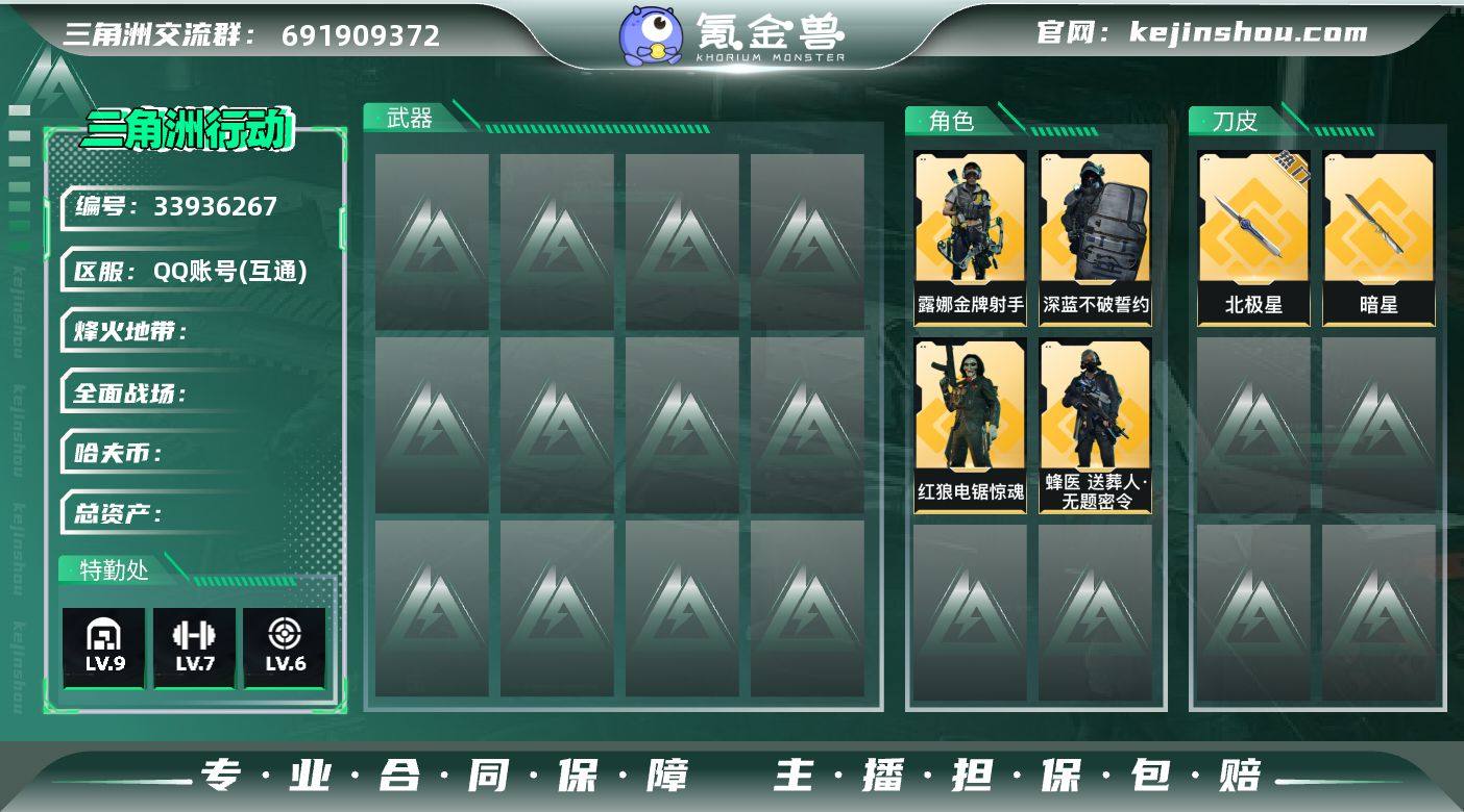 三角洲双刀北极星585M高资产号:【3X3已过期】【刀皮:北极星/暗星】【干员皮肤:红狼-电锯惊魂/蜂医-无题密令/盾构-不破誓约/露娜-金牌射手】【仓库大量六套】【99个咖啡豆】【226发AW+4组红蛋】【马年限定红+机甲+奖杯】【总资产585M/纯币405M】【烽火60级/仓库9/满体力/6负重】