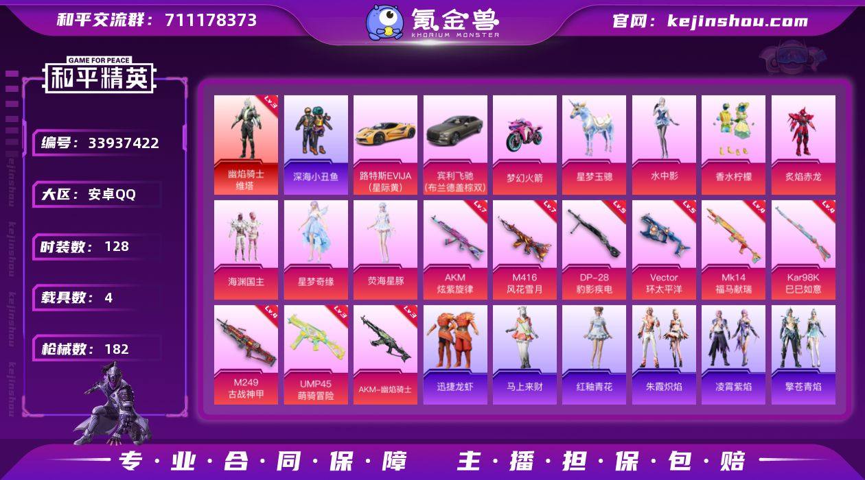 【kyhp2077】安卓 手Q-1神装-6粉装-9特效枪-4载具-4粉色飞行器-63559热力值-6王牌印记-128套装-182枪皮 【红色神装等级】:幽焰骑士-维塔(三级) 【红色角色神装】:幽焰骑士-维塔 【热门品类】:套装-深海小丑鱼,角色-军刀雅典娜,角色-Mark.06 【粉色套装】:粉装-香水柠檬,粉装-炙焰赤龙,粉装-海渊国主,角色-星梦奇缘,角色-荧海星豚,角色-水中影 【粉色枪皮等级】:AKM-炫紫旋律(七级),AKM-幽焰骑士(三级),M416-风花雪月(七级),UMP45-萌骑冒险(三级),Vector-环太平洋(五级),Kar98K-巳巳如意(四级),Mk14-福马献瑞(四级),M249-古战神甲(四级),DP-28-豹影疾电(五级) 【粉色载具】:路特斯EVIJA(星际黄),宾利飞驰(布罗德盖棕双色),双人摩托-梦幻火箭,星梦玉骢 【粉色枪皮】:AKM-炫紫旋律,AKM-幽焰骑士,M416-风花雪月,UMP45-萌骑冒险,Vector-环太平洋,Kar98K-巳巳如意,Mk14-福马献瑞,M249-古战神甲,DP-28-豹影疾电 【粉色飞行器】:炫彩糖果飞行器,梦幻火箭飞行器,星梦奇缘飞行器,幽焰列车飞行器 【粉色降落伞】:天启纪元降落伞,PEL轰鸣竞梦者降落伞,葫芦兄弟降落伞,创世·救赎降落伞,星梦奇缘降落伞,幽焰骑士降落伞,鬼刀降落伞 【稀有套...