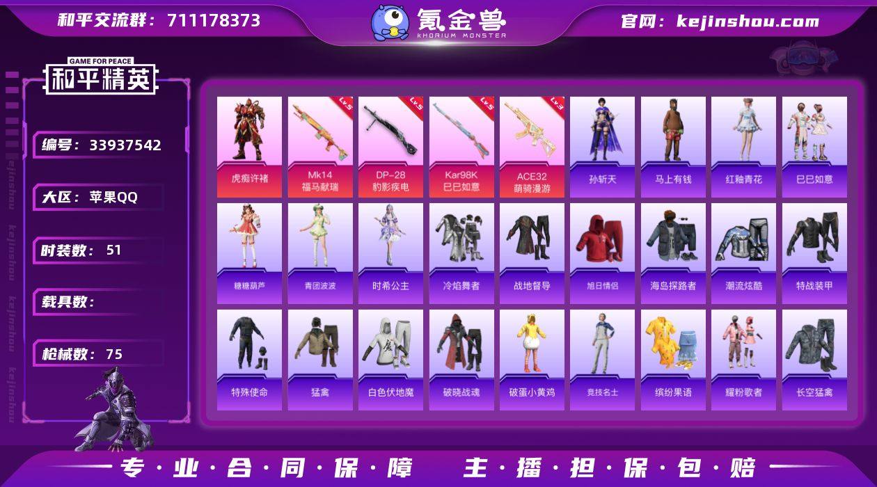 【kyhp2079】苹果 手Q-1粉装-4特效枪-0载具-0粉色飞行器-17841热力值-1王牌印记-51套装-75枪皮 【粉色套装】:角色-虎痴许褚 【粉色枪皮等级】:ACE32-萌骑漫游(三级),Kar98K-巳巳如意(五级),Mk14-福马献瑞(五级),DP-28-豹影疾电(五级) 【粉色枪皮】:ACE32-萌骑漫游,Kar98K-巳巳如意,Mk14-福马献瑞,DP-28-豹影疾电 【粉色降落伞】:千金淑猫降落伞,炫彩糖果降落伞 【稀有套装】:套装-巳巳如意,套装-马上有钱,套装-糖糖葫芦,套装-青团波波,角色-时希公主,套装-雨过天青,套装-红釉青花,角色-孙斩天 【稀有枪皮】:AKM-破晓战魂,M16A4-幻世战舞者,M16A4-蓝色火焰,SCAR-L-夜灯,M416-红色方程式,AUG-耀粉歌者,M762-天降萌叽,M762-彩虹符号,AC-VAL-天降萌叽,UZI-天降萌叽,UZI-月影灵韵,UMP45-夜灯,Vector-生命誓言,汤姆逊-天降萌叽,汤姆逊-像素花束,P90-巳巳如意,M24-炫彩节奏,SKS-炫彩节奏,SKS-糯团青竹,S686-生命誓言,S686-红色方程式,S686-巳巳如意,S12K-玩趣呆呆,M249-破晓战魂,M249-糯团青竹,DP-28-彩虹符号,MG3-幻世战舞者,短管霰弹-星穹咏叹调,撬棍-冷漠罗丽 【其他套装】:套装-冷焰舞者,套装-战地督导,套装-旭日情侣,套装-...