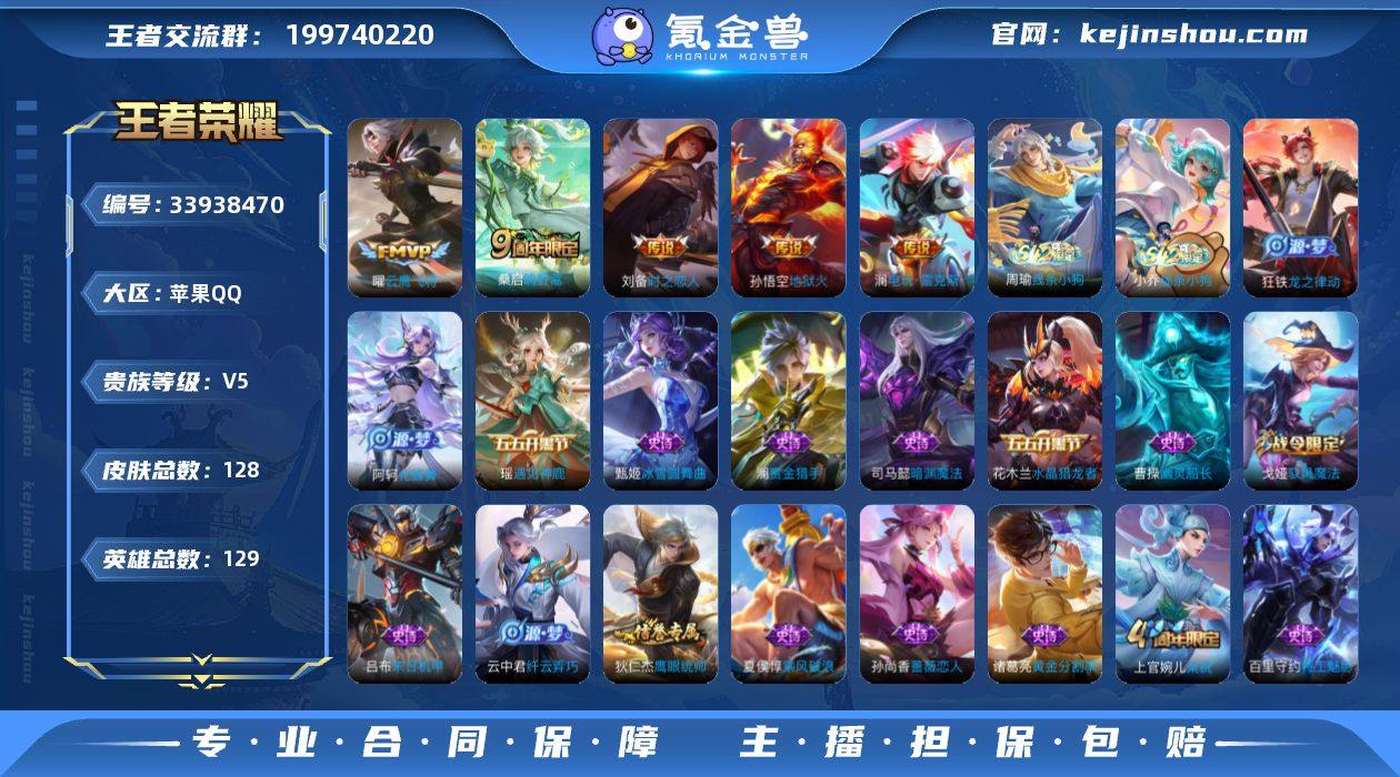 苹果Q-V5-永恒钻石III段位-129英雄-128皮肤-6传说-33史诗【英雄全皮】:孙权全皮,敖隐全皮【传说皮肤】:马超神骥逐星野,桑启鸣野蒿,澜电玩雷克斯,曜云鹰飞将,刘备时之恋人,孙悟空地狱火【限定皮肤】:姜子牙天穹之誓,狄仁杰阴阳师,赵云皇家上将,孙尚香蔷薇恋人,狄仁杰魔术师,狄仁杰万华元夜,达摩沙漠行僧,项羽海滩派对,程咬金演武夺筹,李元芳云中旅人,钟馗驱傩正仪,苏烈千军破阵,沈梦溪大漠名商,裴擒虎擒涛扼浪,云中君纤云弄巧,上官婉儿梁祝,西施玲珑珍味,鲁班大师探海日志,桑启海盐诗旅,戈娅驭风魔法,阿古朵江河有灵,张良古海寻踪,鬼谷子天穹祈灯,刘邦剑破天穹,周瑜熔金海岸【赛季限定】:狄仁杰万华元夜,程咬金演武夺筹,钟馗驱傩正仪,苏烈千军破阵,达摩沙漠行僧,沈梦溪大漠名商,李元芳云中旅人,桑启海盐诗旅,裴擒虎擒涛扼浪,鲁班大师探海日志,张良古海寻踪,鬼谷子天穹祈灯,刘邦剑破天穹,姜子牙天穹之誓,东皇太一噬灭天穹,太乙真人谧流熔炉,钟馗虚灵犬护,亚瑟荣光之誓【战令限定】:戈娅驭风魔法,西施玲珑珍味,周瑜线条小狗,小乔线条小狗【史诗皮肤】:钟馗锁墨魂,明世隐百晓客,周瑜线条小狗,小乔线条小狗,狂铁龙之...