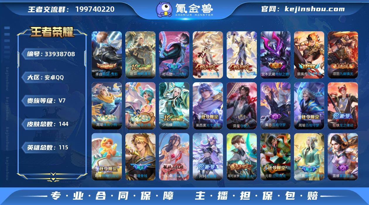安卓Q-V7-永恒钻石III段位-115英雄-144皮肤-1典藏皮肤-1无双-8传说-49史诗【英雄全皮】:司马懿全皮,孙权全皮,敖隐全皮,空空儿全皮【荣耀典藏】:李白鸣剑曳影【无双皮肤】:李信问心剑【传说皮肤】:韩信踏浪归,马超神骥逐星野,后羿神树通天,司马懿九山相柳,司空震愿照山河定,澜愿照九州拓,裴擒虎祥瑞亨通,宫本武藏地狱之眼【限定皮肤】:暃埋骨钱,虞姬夏日便利店,狄仁杰阴阳师,赵云皇家上将,庄周高山流水,元歌云间偶戏,元歌无心,马可波罗山海玄木吟,狄仁杰魔术师,项羽海滩派对【年限皮肤】:马可波罗山海玄木吟,司空震愿照山河定,澜愿照九州拓【赛季限定】:太乙真人谧流熔炉,钟馗虚灵犬护,甄姬逆浪荇歌,亚瑟荣光之誓,项羽九幽镇关【战令限定】:元歌云间偶戏,虞姬夏日便利店,亚连破空之剑,孙膑茶境仙,马超访茗客,刘禅鸭鸭历险记,沈梦溪鸭鸭历险记,周瑜百相守梦,孙策百相守梦,莱西奥光弋星穹,明世隐往忆晖光,周瑜线条小狗,小乔线条小狗【史诗皮肤】:后羿天穹守望者,海月海之女神,钟馗锁墨魂,周瑜线条小狗,小乔线条小狗,项羽九幽镇关,少司缘巫礼祀神,莱西奥光弋星穹,弈星守夜人,黄忠百相守梦,周瑜百相守梦,狂铁龙之律动,...