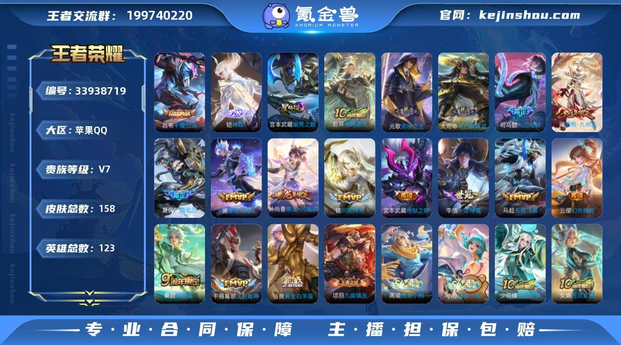 苹果Q-V7-永恒钻石IV段位-123英雄-158皮肤-1典藏皮肤-1无双-17传说-42史诗【英雄全皮】:孙权全皮,敖隐全皮,空空儿全皮,影全皮【荣耀典藏】:吕布千魇归渊【无双皮肤】:铠神罪【传说皮肤】:马超神骥逐星野,后羿神树通天,元歌诡秘之主,大司命死亡执政官,司马懿九山相柳,澜愿照九州拓,云缨幻光神枪,桑启鸣野蒿,夏侯惇霜北刀,孙尚香乘龙问璇玑,澜逐花归海,马超无双飞将,镜炽阳神光,李信一念神魔,张良黄金白羊座,干将莫邪久胜战神,宫本武藏地狱之眼【限定皮肤】:夏侯惇霜北刀,虞姬夏日便利店,姜子牙天穹之誓,狄仁杰阴阳师,赵云皇家上将,狄仁杰魔术师,项羽海滩派对,亚瑟潮玩骑士王,孙悟空至尊宝,李元芳云中旅人,百里玄策原初追逐者,张良古海寻踪,鬼谷子天穹祈灯,孙尚香乘龙问璇玑【年限皮肤】:孙尚香乘龙问璇玑,澜愿照九州拓【赛季限定】:李元芳云中旅人,张良古海寻踪,鬼谷子天穹祈灯,姜子牙天穹之誓,太乙真人谧流熔炉,钟馗虚灵犬护,甄姬逆浪荇歌,亚瑟荣光之誓,百里玄策原初追逐者,项羽九幽镇关【战令限定】:亚瑟潮玩骑士王,虞姬夏日便利店,刘禅鸭鸭历险记,沈梦溪鸭鸭历险记,周瑜百相守梦,孙策百相守梦,莱西奥光弋星穹,明...