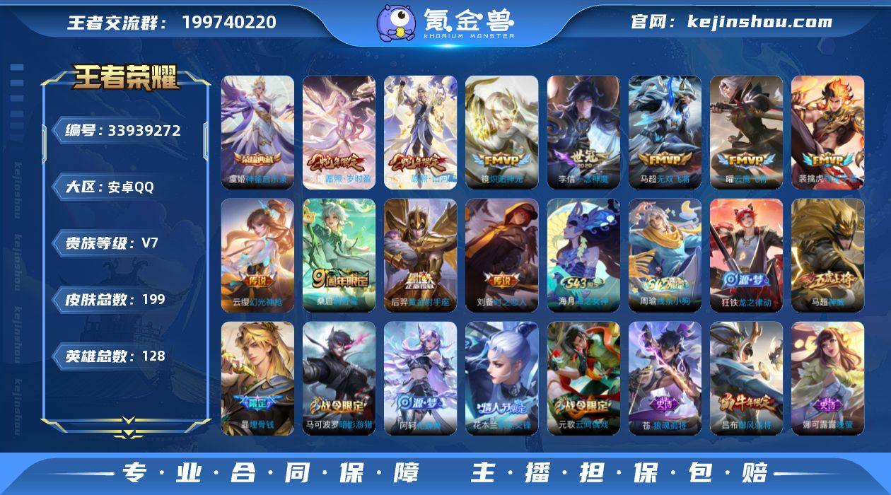 安卓Q-V7-最强王者段位-128英雄-199皮肤-1典藏皮肤-11传说-55史诗 【英雄全皮】:苍全皮,敖隐全皮 【荣耀典藏】:虞姬神鉴启示录 【传说皮肤】:司空震愿照山河定,虞姬愿照岁时盈,云缨幻光神枪,裴擒虎祥瑞亨通,桑启鸣野蒿,马超无双飞将,镜炽阳神光,曜云鹰飞将,李信一念神魔,刘备时之恋人,后羿黄金射手座 【限定皮肤】:白起狰,暃埋骨钱,姜子牙天穹之誓,杨戬破阵退雄兵,狄仁杰阴阳师,赵云皇家上将,墨子降魔,孙尚香蔷薇恋人,芈月重明,吕布御风骁将,元歌云间偶戏,曹操烛龙,典韦穷奇,马可波罗暗影游猎,狄仁杰魔术师,狄仁杰万华元夜,达摩沙漠行僧,项羽海滩派对,老夫子醍醐杖,程咬金演武夺筹,兰陵王金庭之子,花木兰默契交锋,亚瑟潮玩骑士王,李元芳云中旅人,钟馗驱傩正仪,干将莫邪胡桃夹子,雅典娜单词大作战,鬼谷子原初探秘者,百里玄策原初追逐者,弈星混沌棋,沈梦溪大漠名商,明世隐疑决卦,裴擒虎李小龙,狂铁御狮,米莱狄御霄,云中君纤云弄巧,盾山御銮,上官婉儿梁祝,蒙犽狂想玩偶喵,暃星界游侠,阿古朵江河有灵,张良古海寻踪,鬼谷子天穹祈灯,沈梦溪龙舞盛年,刘邦剑破天穹,程咬金群星魔术团,周瑜熔金海岸 【年限皮肤】:吕布御...