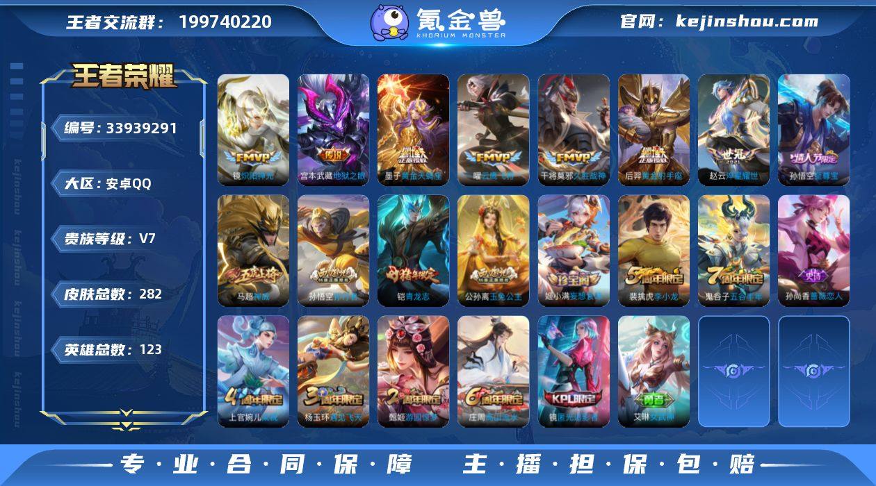 安卓Q 可二次 1典藏9传说123英雄282皮肤 刘禅全皮 鸣剑曳影 黄金天蝎座 无限倾心女 淬星耀世 炽阳神光 云鹰飞将 久胜战神 黄金射手座 地狱之眼 末日机甲女 涂山容容 神威 至尊宝 青龙志 嫦娥如梦令 拒霜思 匿光追影者 玉兔公主 孙行者 朔望之晖 星空之诺 银河之约 原初追逐者 黎明之约 死神来了 梁祝 云间偶戏 苍穹之光 暗夜猫娘 电玩小子 黄忠百相守梦 燃音魔法 电玩爆裂旋风 天秀启明 时之奇旅安琪 无限星赏官 原初探秘者 李小龙 水晶猎龙者 暗隐猎兽者 猫狗日记男 猫狗日记女 金属风暴 地狱岩魂 热力回旋 特工魅影 特工战影 女武神 青蛇 王者荣耀账号
