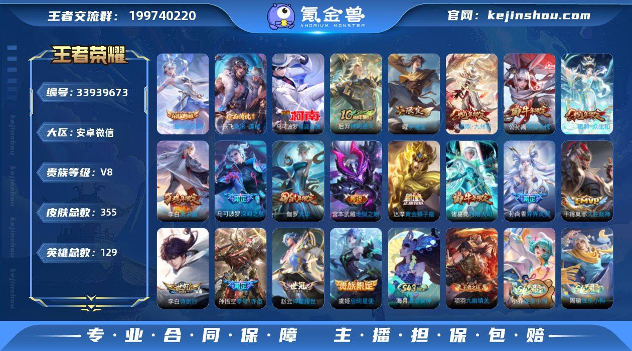 安卓WX-V8-至尊星耀I段位-129英雄-355皮肤-1典藏皮肤-2珍品传说-17传说-112史诗 【英雄全皮】:孙权全皮,苏烈全皮,猪八戒全皮,敖隐全皮,空空儿全皮 【荣耀典藏】:伽罗最初的交响 【珍品传说】:张飞兔狲蓬尾,马可波罗怪盗基德 【传说皮肤】:后羿神树通天,妲己愿照众生和,澜愿照九州拓,李白诗剑行,马可波罗深海之息,孙尚香异界灵契,赵云淬星耀世,曜李逍遥 ,公孙离祈雪灵祝,诸葛亮时雨天司,虞姬启明星使,孙悟空零号赤焰,伽罗太华,干将莫邪久胜战神,达摩黄金狮子座,李白凤求凰,宫本武藏地狱之眼 【限定皮肤】:大乔绒语心约,姜子牙天穹之誓,狄仁杰阴阳师,赵云皇家上将,妲己时之彼端,孙尚香蔷薇恋人,孙尚香异界灵契,鲁班七号狮舞东方,鲁班七号乒乒小将,庄周高山流水,高渐离玩趣恶龙,钟无艳超时空战士,白起夜都怪侠,芈月重明,芈月白晶晶,芈月幻夜卜梦,吕布御风骁将,周瑜赤莲之焰,元歌云间偶戏,元歌无心,夏侯惇朔风刀,夏侯惇匿光决锋者,甄姬落雪兰心,曹操烛龙,曹操天狼征服者,典韦蓝屏警告,典韦岱宗,马可波罗暗影游猎,马可波罗深海之息,马可波罗山海玄木吟,狄仁杰魔术师,狄仁杰万华元夜,达摩星际陆战队,达摩沙漠行僧,项羽...