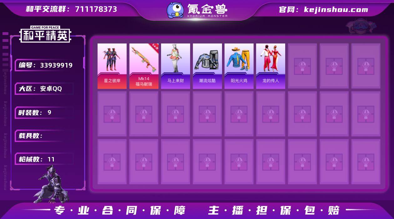 安卓 手Q-1粉装-1特效枪-0载具-0粉色飞行器-2817热力值-1王牌印记-9套装-11枪皮 【粉色套装】:粉装-星之彼岸 【粉色枪皮等级】:Mk14-福马献瑞(五级) 【粉色枪皮】:Mk14-福马献瑞 【稀有套装】:套装-马上来财 【稀有枪皮】:M416-糯团青竹,AUG-耀粉歌者,蜜獾-天降萌叽,汤姆逊-像素花束 【其他套装】:套装-潮流炫酷,套装-阳光火鸡,套装-龙的传人 【营地ID】:1048636884