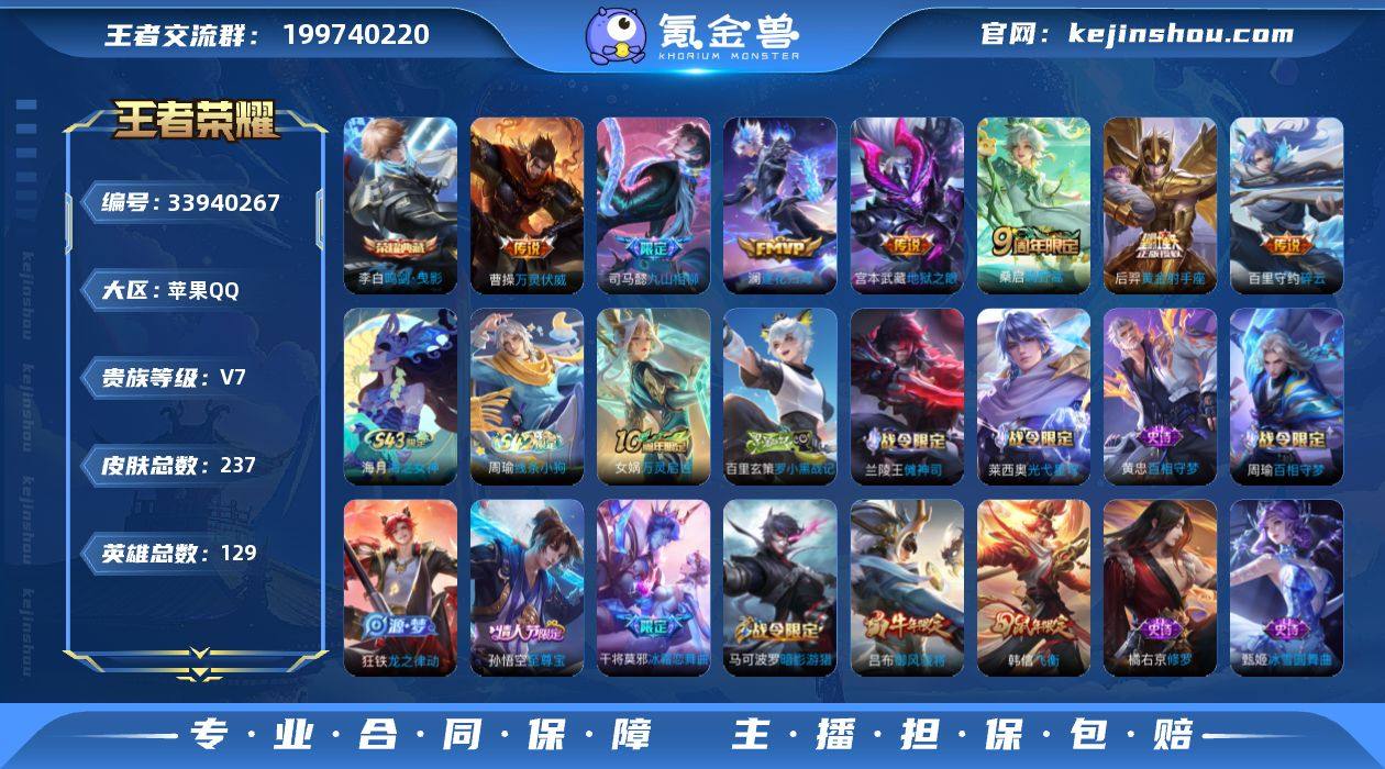 苹果Q-V7-至尊星耀III段位-129英雄-237皮肤-1典藏皮肤-7传说-66史诗 【英雄全皮】:司马懿全皮,孙权全皮 【荣耀典藏】:李白鸣剑曳影 【传说皮肤】:曹操万灵伏威,司马懿九山相柳,桑启鸣野蒿,澜逐花归海,百里守约碎云,后羿黄金射手座,宫本武藏地狱之眼 【限定皮肤】:白起狰,虞姬夏日便利店,姜子牙天穹之誓,狄仁杰阴阳师,虞姬凯尔特女王,赵云皇家上将,嬴政白昼王子,孙尚香蔷薇恋人,鲁班七号狮舞东方,庄周高山流水,高渐离玩趣恶龙,芈月重明,芈月幻夜卜梦,吕布猎兽之王,吕布御风骁将,夏侯惇朔风刀,甄姬游园惊梦,曹操烛龙,典韦穷奇,马可波罗暗影游猎,狄仁杰魔术师,狄仁杰万华元夜,达摩沙漠行僧,项羽海滩派对,老夫子醍醐杖,程咬金演武夺筹,韩信飞衡,兰陵王金庭之子,孙悟空至尊宝,牛魔御旌,李元芳云中旅人,钟馗神迹守卫,钟馗驱傩正仪,干将莫邪冰霜恋舞曲,雅典娜单词大作战,蔡文姬繁星吟游,太乙真人饕餮,鬼谷子原初探秘者,鬼谷子五谷丰年,黄忠火炮绅士,苏烈千军破阵,弈星混沌棋,梦奇顽趣,沈梦溪大漠名商,明世隐疑决卦,裴擒虎李小龙,裴擒虎擒涛扼浪,狂铁御狮,米莱狄御霄,云中君纤云弄巧,盾山御銮,猪八戒西部大镖客,上官...