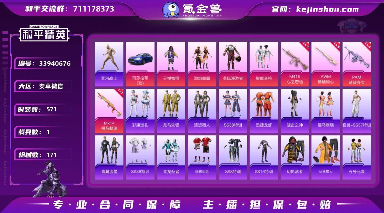 微信区精品和平精英账号,可二次实名,能直接改实名信息,杜绝找回风险。 账号长期自用,无任何违规、封号、开挂、组队不良记录,纯白安全号。 ✅硬货:白木乃伊套装、星际漫游者 ✅经典载具:蓝色玛莎拉蒂 ✅满级特效枪:M416-心之恋语(满级7) ✅粉枪/特效枪:AWM橘柚倾心、M24香水柠檬、PKM萌萌夺宝 ✅热门身法老六套装:雪山精英、暗影哥特、狂沙舞者 总套装141+,枪械皮肤171+,五万三热力值,多赛季王牌印记,底子很厚,素材充足。 个人一手自玩号,诚心出售平台担保交易,放心购买。