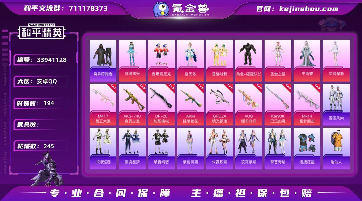 安卓 手Q-8粉装-8特效枪-0载具-1粉色飞行器-77258热力值-12王牌印记-194套装-245枪皮 【热门品类】:粉装-音爆索尼克,套装-奇异狩猎者,套装-龟仙人,套装-暗影哥特,套装-粉红小猪,角色-Mark.06 【粉色套装】:角色-洛天依,粉装-垂柳戏鸭,粉装-音爆索尼克,角色-猩猩队长,角色-圣堂之誓,角色-宁雨蝶,角色-荧海星豚,角色-异瞳寒姬 【粉色枪皮等级】:AKM-绿萝繁花(五级),GROZA-镜光银凌(五级),AUG-暖羊咩咩(五级),AKS-74U-森灵之息(五级),Kar98K-巳巳如意(五级),Mk14-甜梦熊击(五级),M417-第五大道(七级),DP-28-豹影疾电(五级) 【粉色枪皮】:AKM-绿萝繁花,GROZA-镜光银凌,AUG-暖羊咩咩,AKS-74U-森灵之息,Kar98K-巳巳如意,Mk14-甜梦熊击,M417-第五大道,DP-28-豹影疾电 【粉色降落伞】:洛神天依降落伞,蓝莓炮弹降落伞,暗夜鎏金降落伞,第五大道降落伞,仲夏莫吉托降落伞,飒粉甜心降落伞,闲梦青缨降落伞,炫光之旅降落伞,精灵梦叶罗丽降落伞,创世·救赎降落伞,幻彩电音降落伞,异瞳寒姬降落伞,炫彩糖果降落伞 【稀有套装】:套装-龟仙人,玩偶服-憨乐熊二,套装-巳巳如意,套装-雪国风尚,套装-炫彩糖果,套装-雏菊兔兔,套装-萝兰蝴蝶,套装-小...