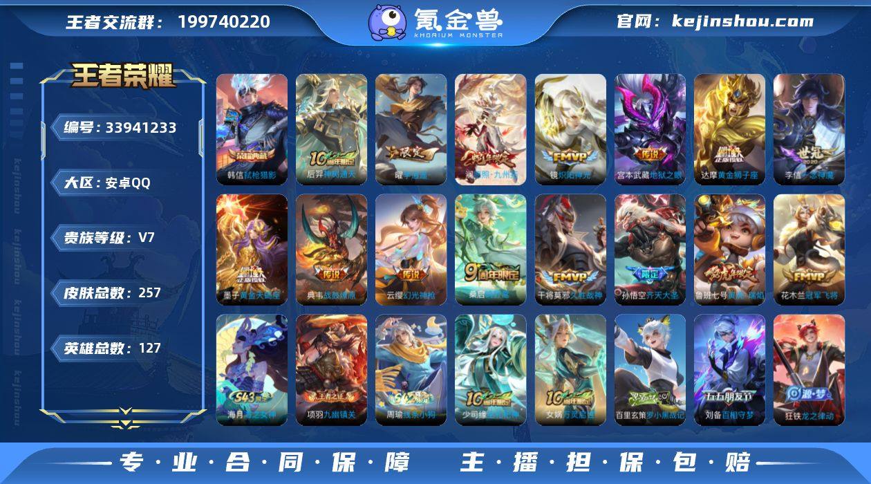 安卓Q-V7-永恒钻石II段位-127英雄-257皮肤-1典藏皮肤-15传说-64史诗 【英雄全皮】:孙权全皮,影全皮 【荣耀典藏】:韩信弑枪猎影 【传说皮肤】:后羿神树通天,澜愿照九州拓,云缨幻光神枪,桑启鸣野蒿,墨子黄金天蝎座,典韦战鼓燎原,孙悟空齐天大圣,鲁班七号寅虎瑞焰,曜李逍遥 ,镜炽阳神光,李信一念神魔,干将莫邪久胜战神,达摩黄金狮子座,花木兰冠军飞将,宫本武藏地狱之眼 【限定皮肤】:白起狰,姜子牙天穹之誓,杨戬破阵退雄兵,狄仁杰阴阳师,虞姬凯尔特女王,赵云皇家上将,墨子神迹守卫,鲁班七号寅虎瑞焰,庄周高山流水,高渐离死亡摇滚,高渐离玩趣恶龙,扁鹊炼金王,芈月重明,芈月幻夜卜梦,夏侯惇朔风刀,曹操烛龙,典韦穷奇,典韦蓝屏警告,马可波罗山海玄木吟,狄仁杰魔术师,狄仁杰万华元夜,达摩沙漠行僧,项羽海滩派对,老夫子醍醐杖,老夫子航海奇遇记,关羽冰锋战神,程咬金演武夺筹,韩信傲雪梅枪,王昭君凤凰于飞,兰陵王金庭之子,孙悟空至尊宝,孙悟空齐天大圣,牛魔御旌,刘备百相守梦,李元芳云中旅人,钟馗驱傩正仪,蔡文姬繁星吟游,太乙真人饕餮,太乙真人华丽摇滚,鬼谷子原初探秘者,鬼谷子五谷丰年,黄忠火炮绅士,苏烈千军破阵,弈...